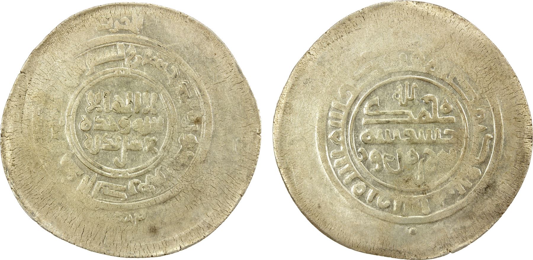 BANIJURID: al-Harith b. Harb, 10th century, AR multiple dirham (10.03g), Kurat Badakhshan, ND, A-1439, al-Harith b. Harb cited in the obverse margin; also citing the Samanid Nuh b. Mansur (AH366-387), lustrous Unc.