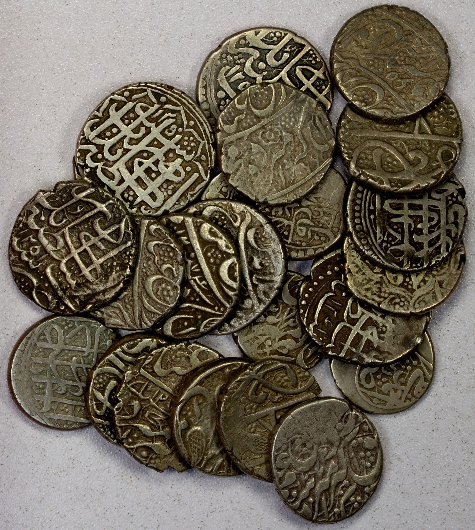 BARAKZAI: Dost Muhammad, 1842-1863, LOT of 23 silver coins, Kabul: Types A-3157 (KM-478): dates AH1241, 1242, 1243, 1244; A-A3158 (KM-480): 1246, 1247, 1250; A-3158 (KM-481): 1251, 1252; A-3162 (KM-497): 1263, 1265, 1266, 1267, 1269, 1270, 1271, 1273, and 1276; Ahmadshahi: A-3162 (KM-188): 1272; and A-3163.2 (KM-187.1) (qandahari rupee): 1272 (2 varieties), 1274, and 1278; average Fine to VF condition; retail value $450, lot of 23 pieces.