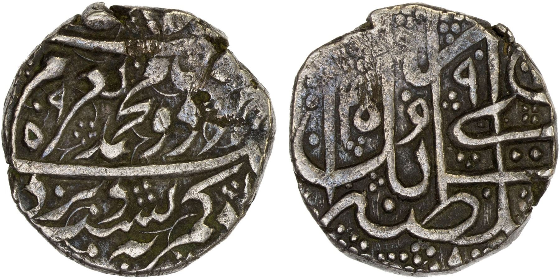 BARAKZAI: Dost Muhammad, second reign, 1842-1863, AR rupee (9.23g), Kabul, AH1259//1259, A-Y3162, extremely rare type bearing the couplet of his previous reign (type A-3158), known dated 1258 and 1259, introduced by his son Muhammad Akbar in anticipation of this father return to Kabul, which occurs somewhat later in AH1259, VF, RRR. See the article by Goron in JONS-211, pp. 32-33.