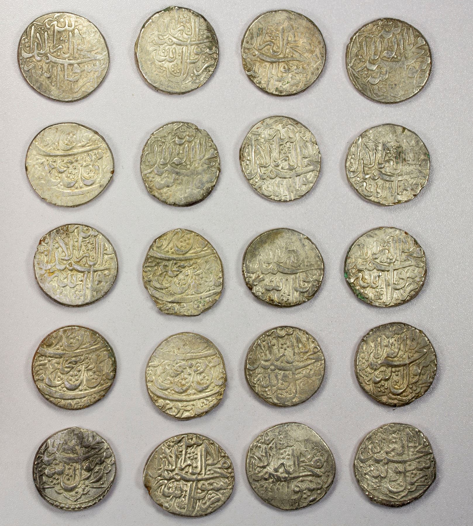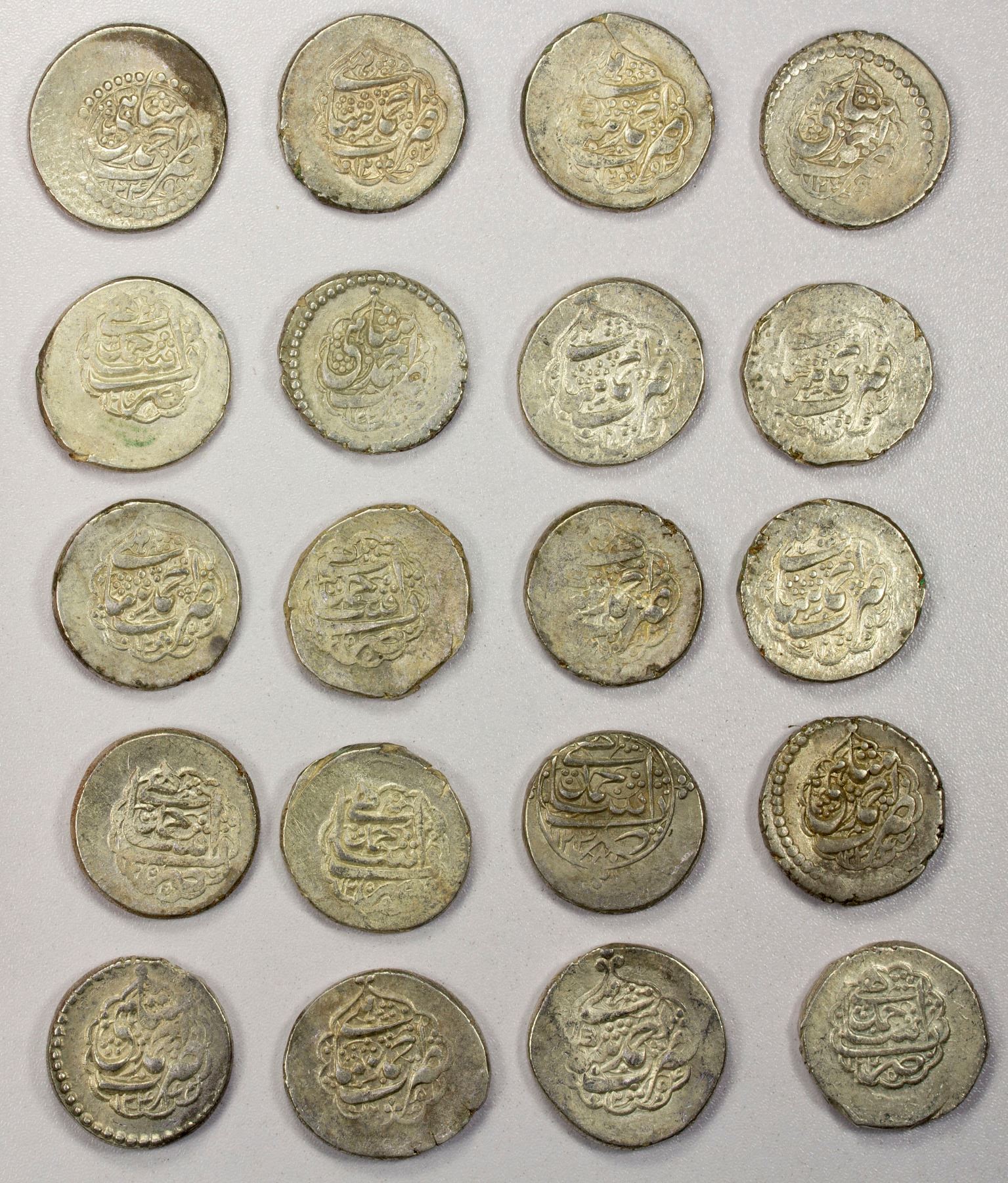 BARAKZAI: LOT of 20 silver rupees, mint of Ahmadshahi (= Qandahar), including type A-E3138 of Purdil Khan dated AH1244; A-H3138 of Kohandil Khan, mostly dated 1249, 1252, 1253, and 1254; and A-3145.1 of the Durrani Shuja' al-Mulk dated 1255; average VF to EF condition, many with minor weakness, retail value $450, lot of 20 pieces.