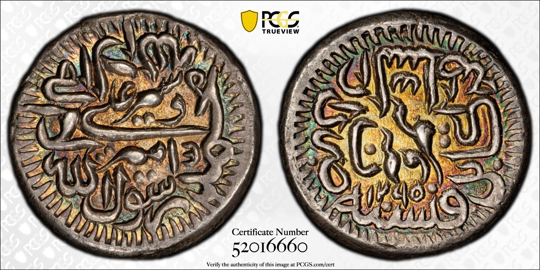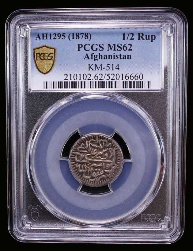 BARAKZAI: Sher 'Ali, 1863-1879, AR 1/2 rupee, Kabul, AH1295, A-3168.2, KM-514, thick calligraphy milled type, with Persian denomination nim rupiyeh "half rupee", a pleasing mint state example! PCGS graded MS62, ex Pars Coins Auction 23, Lot 224, ex William Warden.