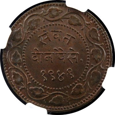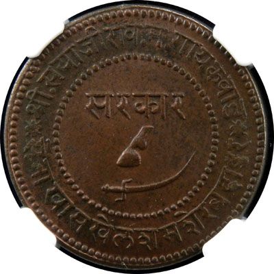 BARODA: AE 2 paisa, VS1949 (1892), Y-32.2A, NGC graded MS-63 Brown.