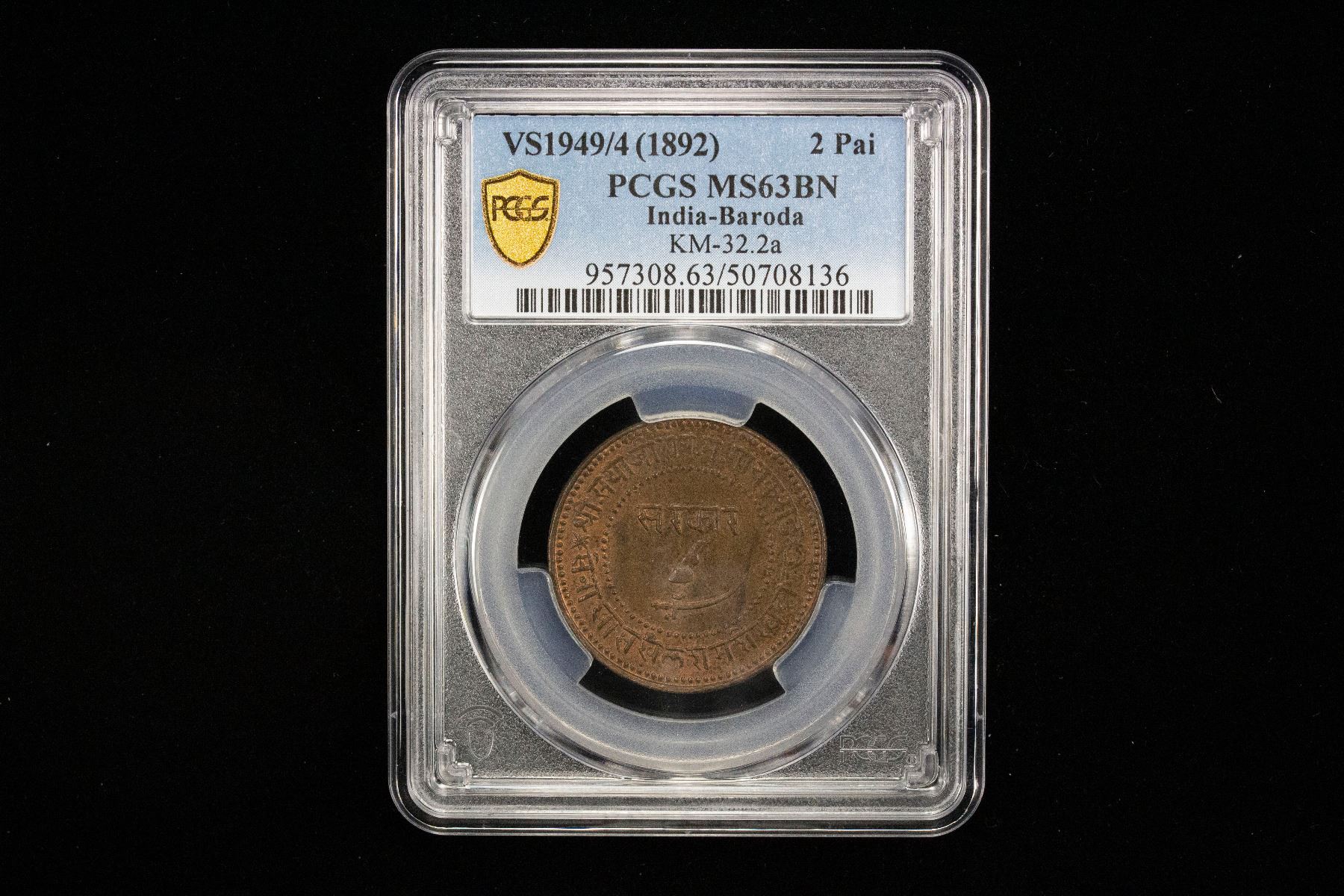 BARODA: Sayaji Rao III, 1875-1938, AE 2 paisa, VS1949 (1892), PCGS MS63 BN