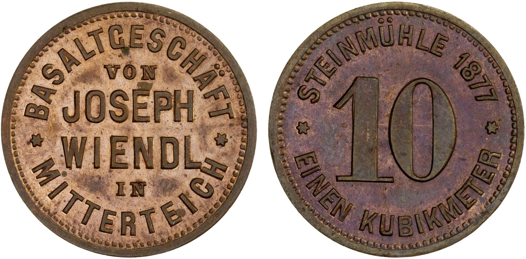 BAVARIA: AE token, 1877, issued for the basalt works (Basaltgeschäft) of Joseph Wiendl in Mitterteich in Bayreuth (founded in Steinmühle in 1877), good for 1/10 of a cubic meter, beautiful purple and orange patina with brilliant luster, Unc.