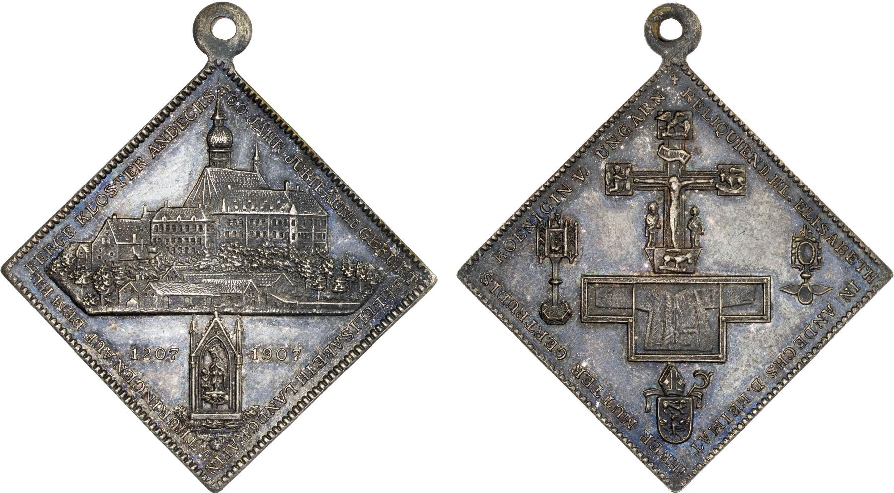 BAVARIA: Andechs (Municipality), klippe medal (12.47g), 1907, Slg. Peus 191, 31x31mm unsigned silver-plated brass klippe for the 700th Anniversary of the Holy Elisabeth Monestery Complex, monestery, with steeple detail below with flanking dates "1207 - 1907", and "700 JAHR.JUBILÄUMd GEBURT d HL.ELISABETH LANDGRÄFIN v. THÜRINGEN AUF DEM HL. BERGE KLOSTER ANDECHS" around // cross with embellished ends with vestment in 3-panelled plaquette below and ornaments around with + RELIQUIEND.HL. ELISABETH IN ANDECHS D.HEIMAT IHRER MUTTER GERTRUDIS KOENIGEN V. UNGARN around, with integral loop for suspension, attractively toned, plain edge, XF-AU. The Andechs Abbey, a Benedictine monestery, has brewed beer since 1455.