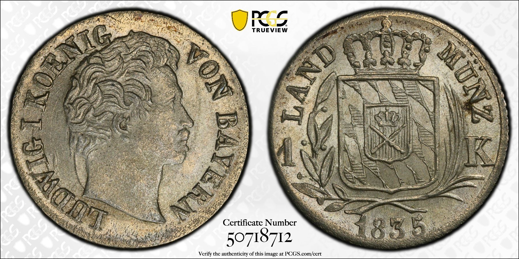 BAVARIA: Ludwig I, 1825-1848, BI kreuzer, 1835, PCGS MS66