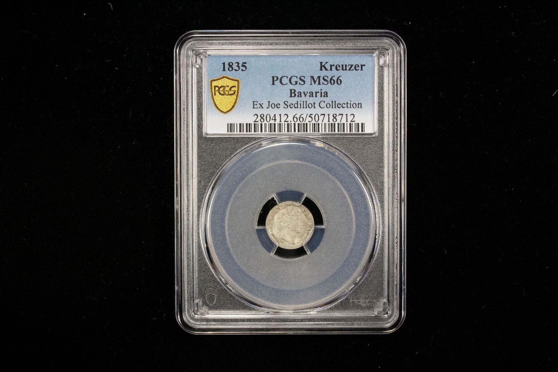 BAVARIA: Ludwig I, 1825-1848, BI kreuzer, 1835, KM-746, C-161a, a fantastic lustrous argent mint state example! PCGS graded MS66, ex Joe Sedillot Collection. In 1835, Bavaria took a major step into the modern era with the opening of Germany’s first railway. Under King Ludwig I, it also experienced cultural and architectural flourishing, while remaining politically conservative within the German Confederation.
