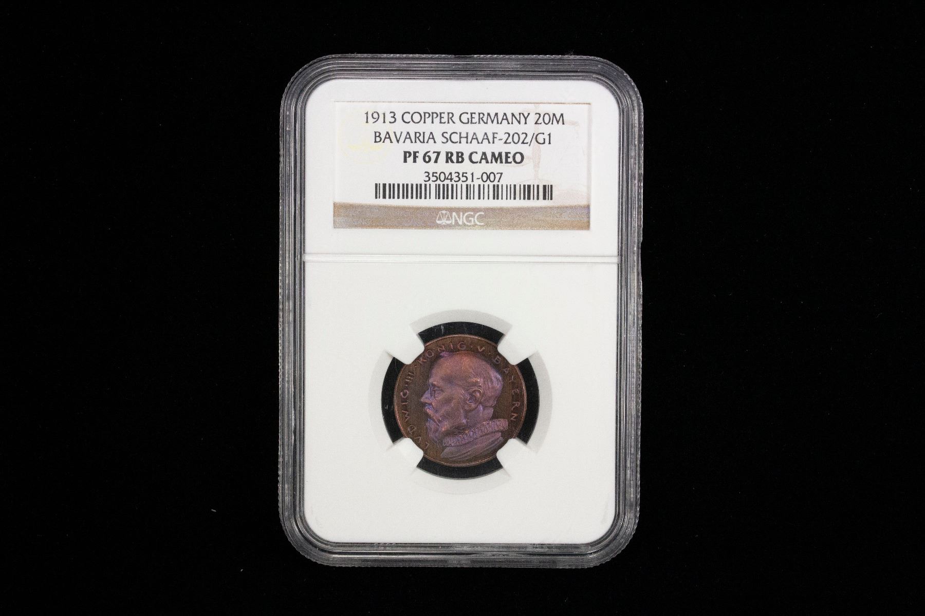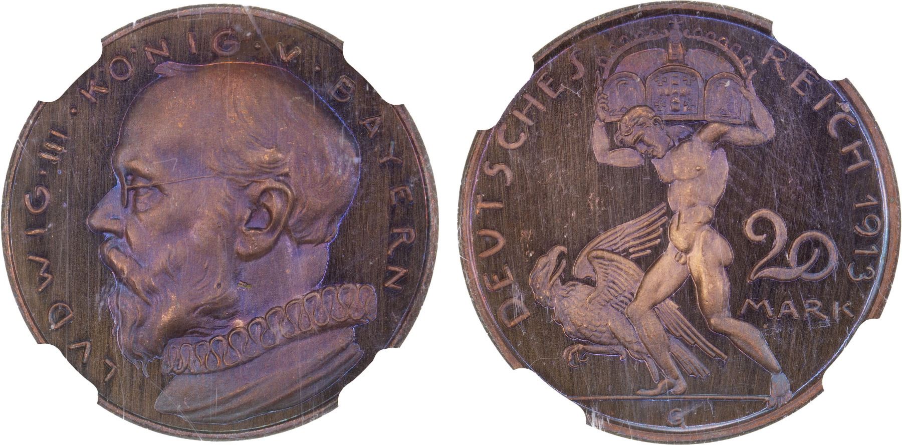 BAVARIA: Ludwig III, 1913-1918, AE 20 mark, 1913, Schaaf-202/G1, private pattern designed by Karl Goetz, bust left with LUDWIG III KÖNIG BAYERN around // nude male figure walking left under strain of enormous crown, with eagle at lower left, and "DEUTSCHES - REICH 1913" around and "G" (for Goetz) in exergue, 22.5mm diameter, 1mm thick with smooth edge, fantastic bluish tone, NGC graded Proof 67 RB CAMEO, ex Heritage Auction 271839, Lot 40240. Finest graded at NGC.