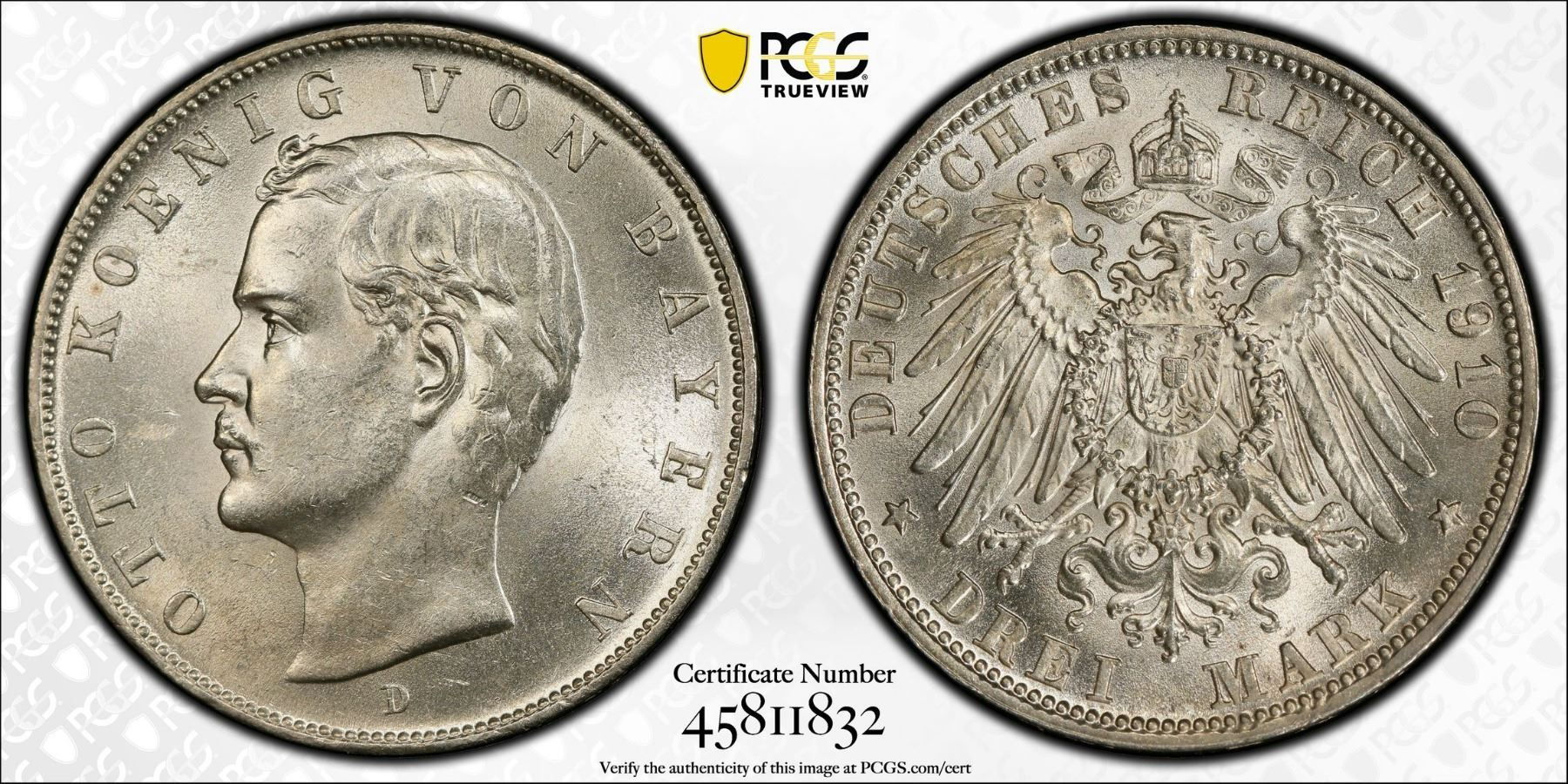 BAVARIA: Otto, 1886-1913, AR 3 mark, 1910-D, PCGS MS63