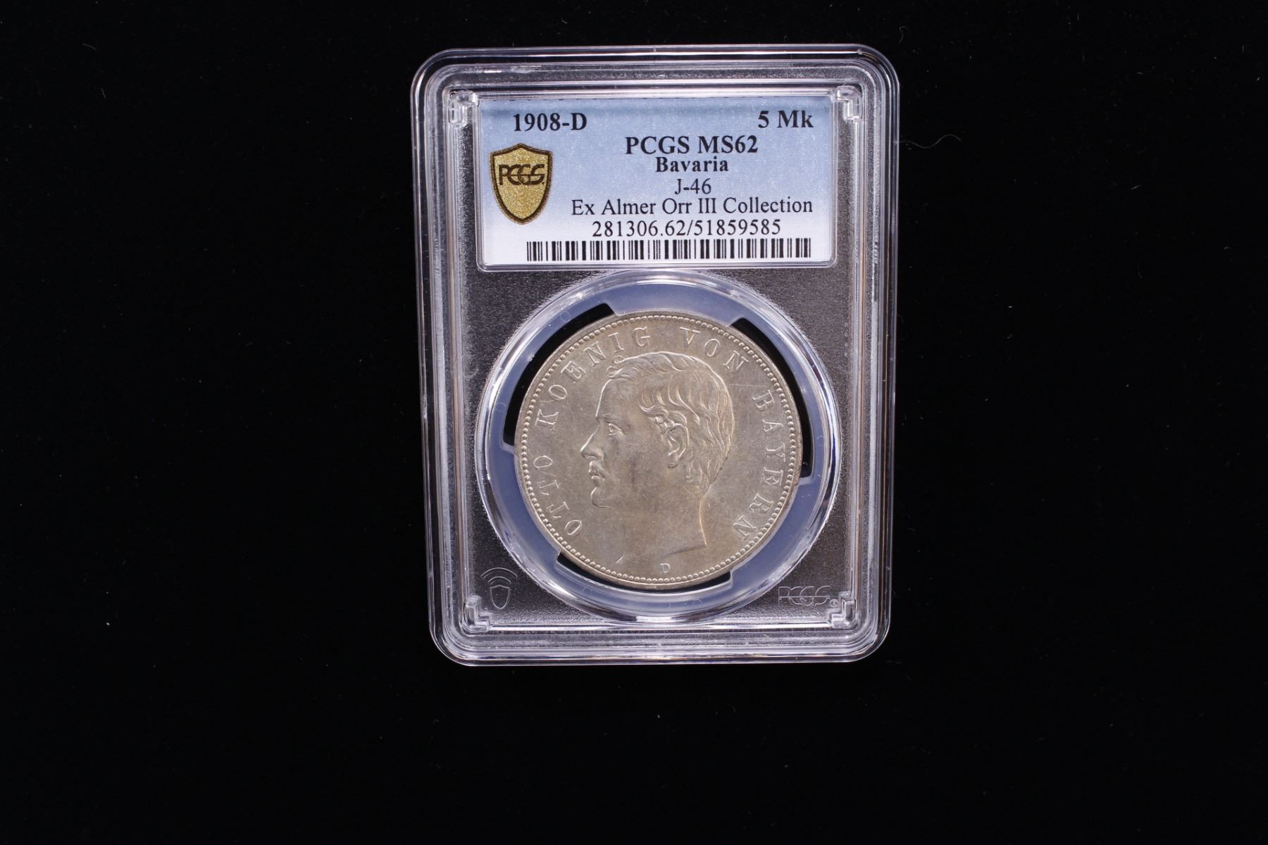 BAVARIA: Otto, 1886-1913, AR 5 mark, 1908-D, KM-915, J-46, Munich mint, an attractive example, PCGS graded MS62, ex Almer H. Orr III Collection.