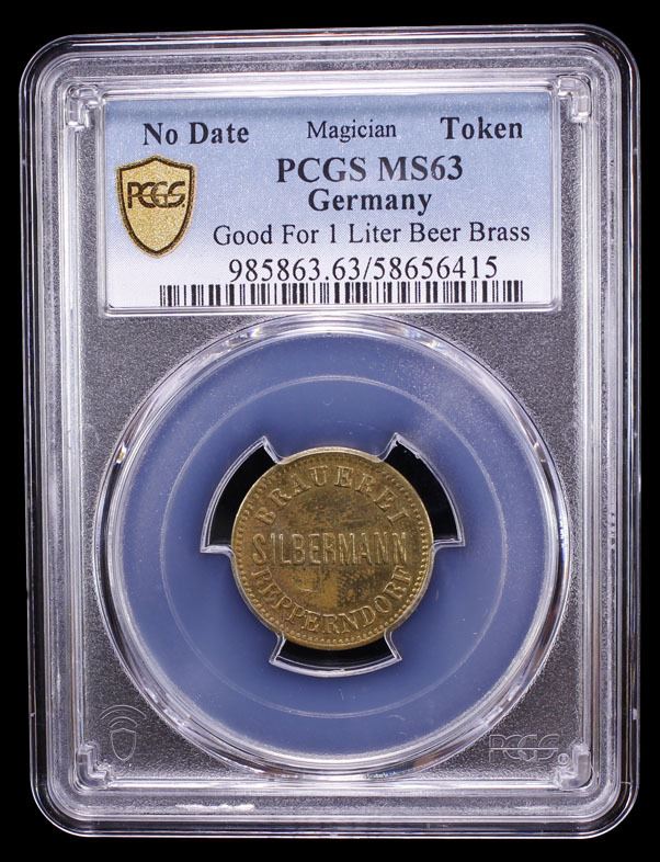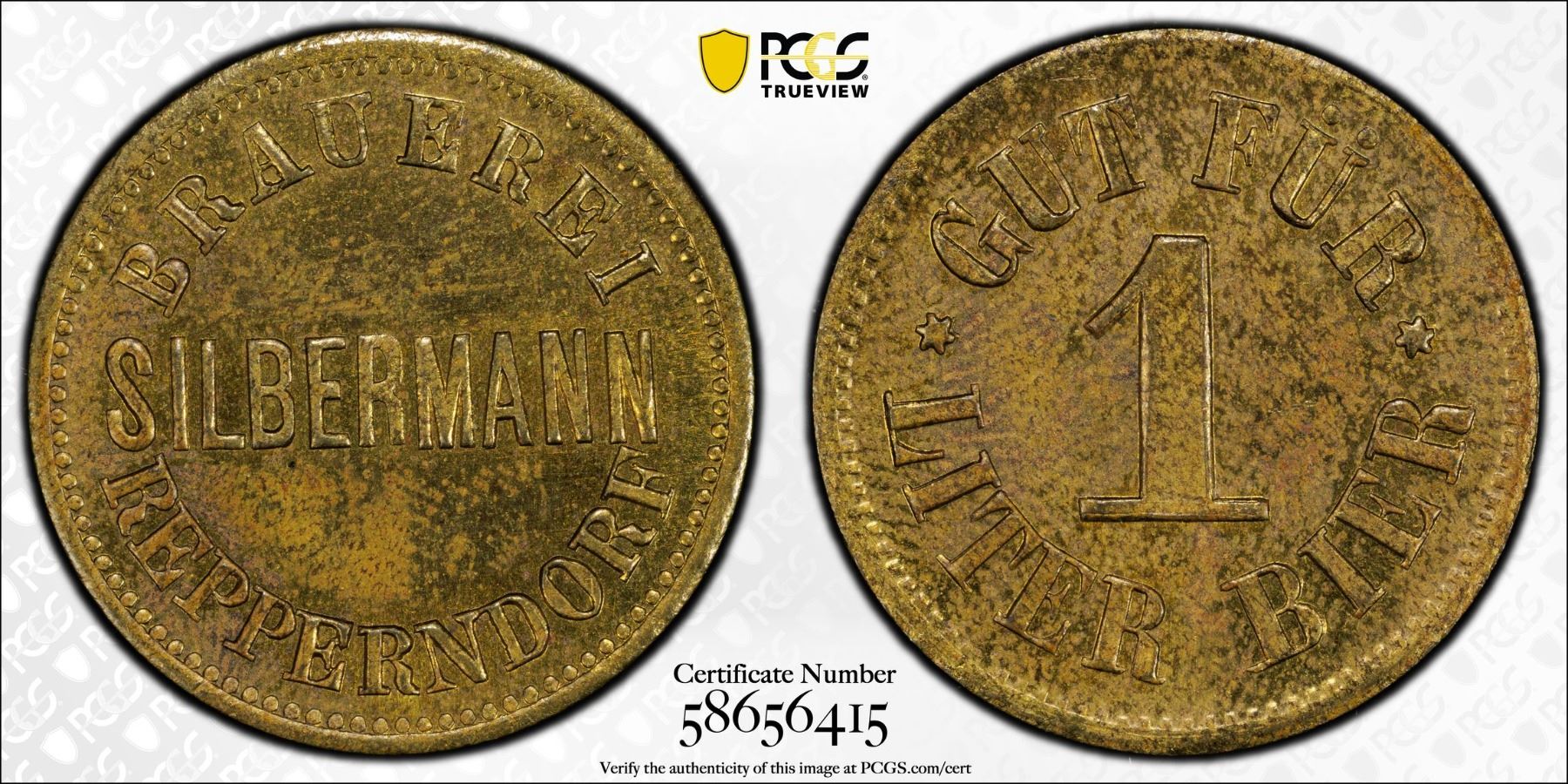 BAVARIA: brass beer token, Menzel-26875.4, BRAUEREI / SILBERMANN / REPPERNDORF // GUT FÜR 1 LITER BIER, a lovely mint state example! PCGS graded MS63. This brewery was founding in 1875 by Christoph Weinmann, the name changed in 1906 to J. Silbermann, again in 1908 to Albert Silbermann, and then in 1920 as Bergbräu GmbH.