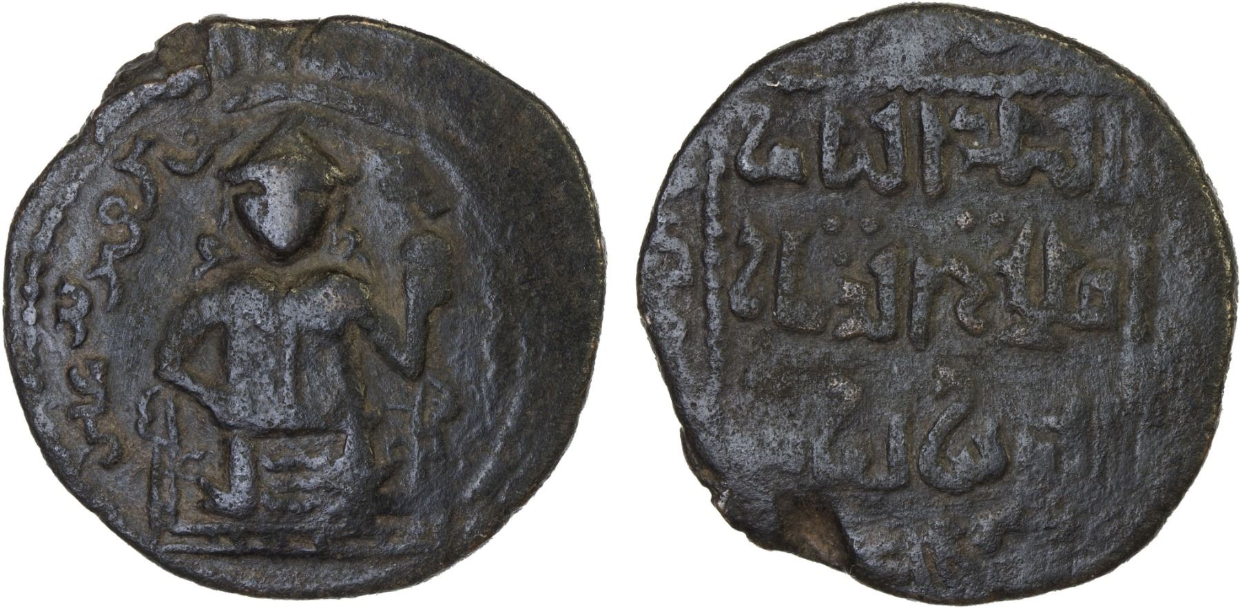 BEGTEGINIDS: Kökburi, 1168-1233, AE dirham (10.40g), [Irbil], ND, A-1888.1, figure enthroned facing, raising right hand // citing the Ayyubid overlord al-Malik al-Nasir Salah al-Din Yusuf (Saladin), decent strike, F-VF.
