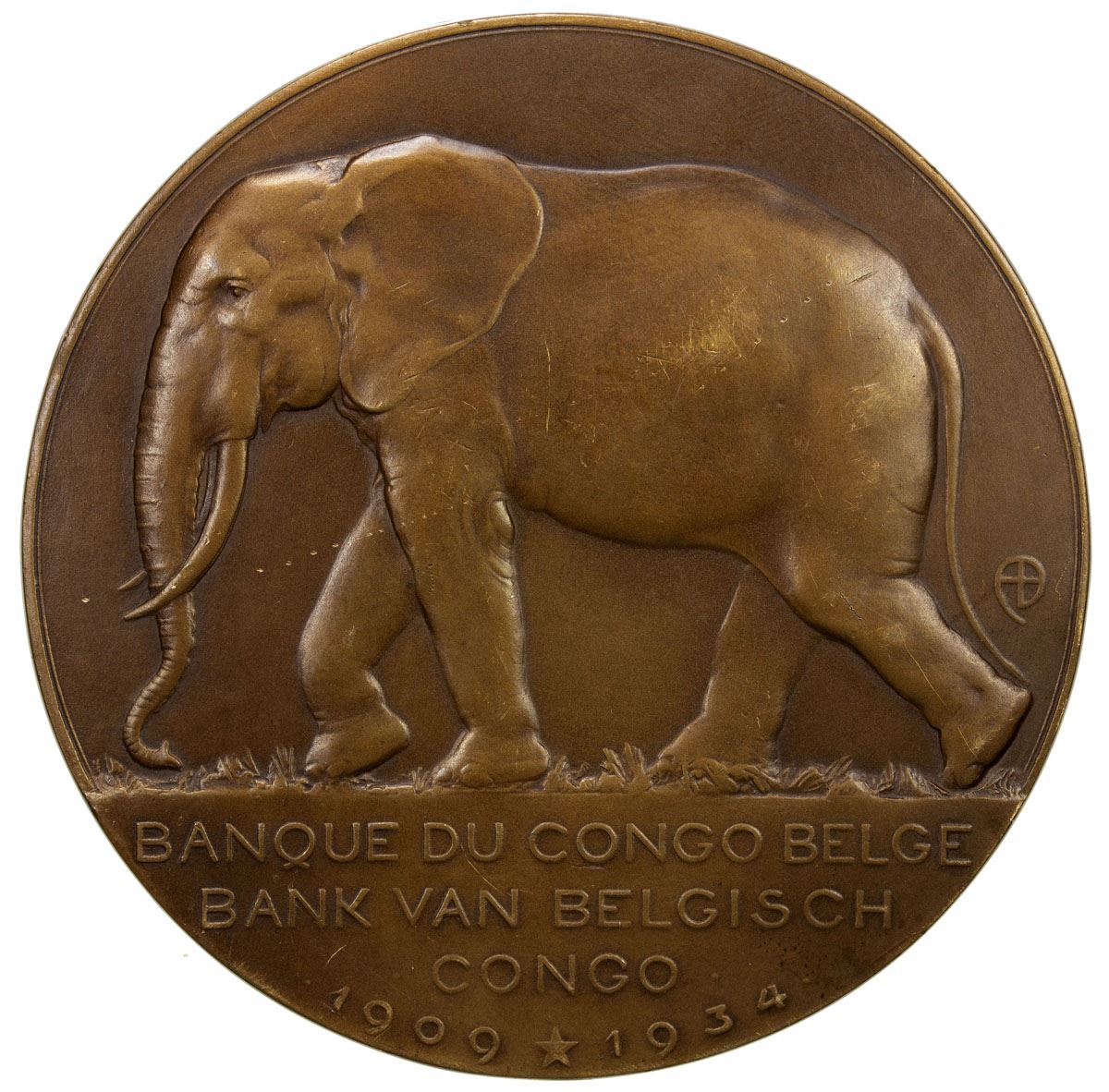 BELGIAN CONGO: AE medal (126.8g), 1934, Vancraenbroeck 141, 71mm bronze medal for the 25th Anniversary of the Banque du Congo Belge by Armand Bonnetin, elephant walking left with BANQUE DU CONGO BELGE / BANK VAN BELGISCH / CONGO / 1909 * 1934 in exergue // native mother standing facing with head left and infant at her breast with large star in right field, J.FONSON stamped on edge, AU, ex Jerry D. Williams Collection. This medal was struck at both Philadelphia and Pretoria. The depiction of the elephant was later used on Belgian Congo coinage during World War II. Photo size reduced.