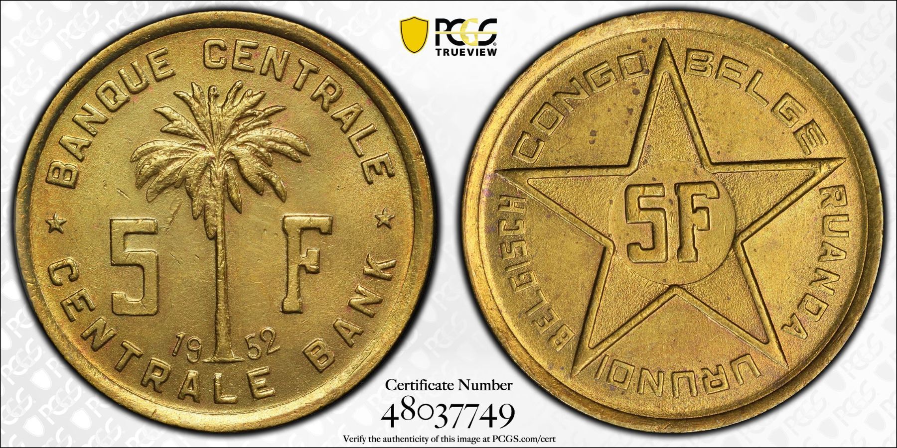 BELGIAN CONGO: Baudouin, 1951-1960, 5 francs, 1952, PCGS UNC details