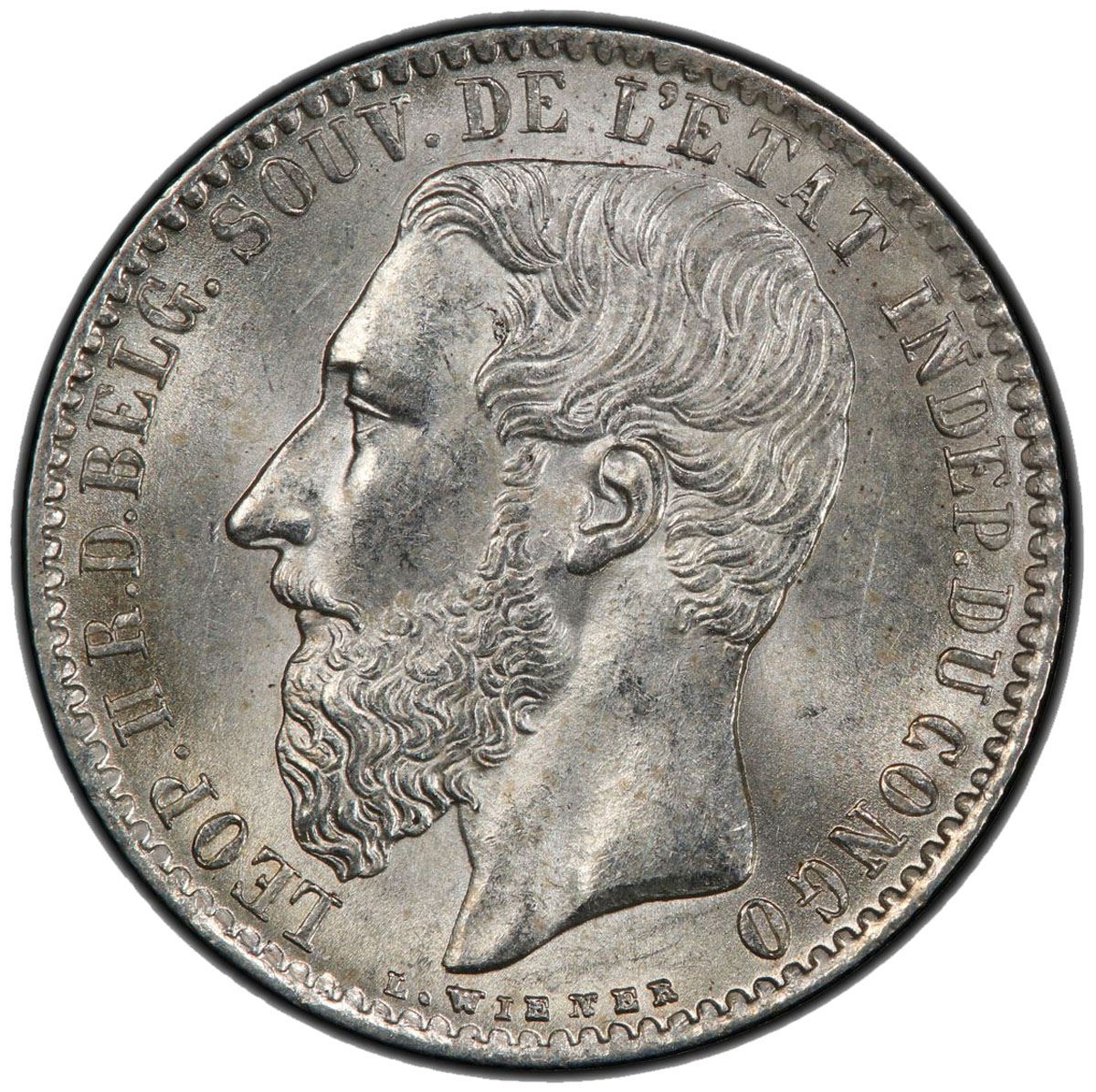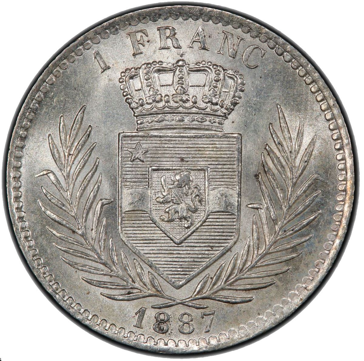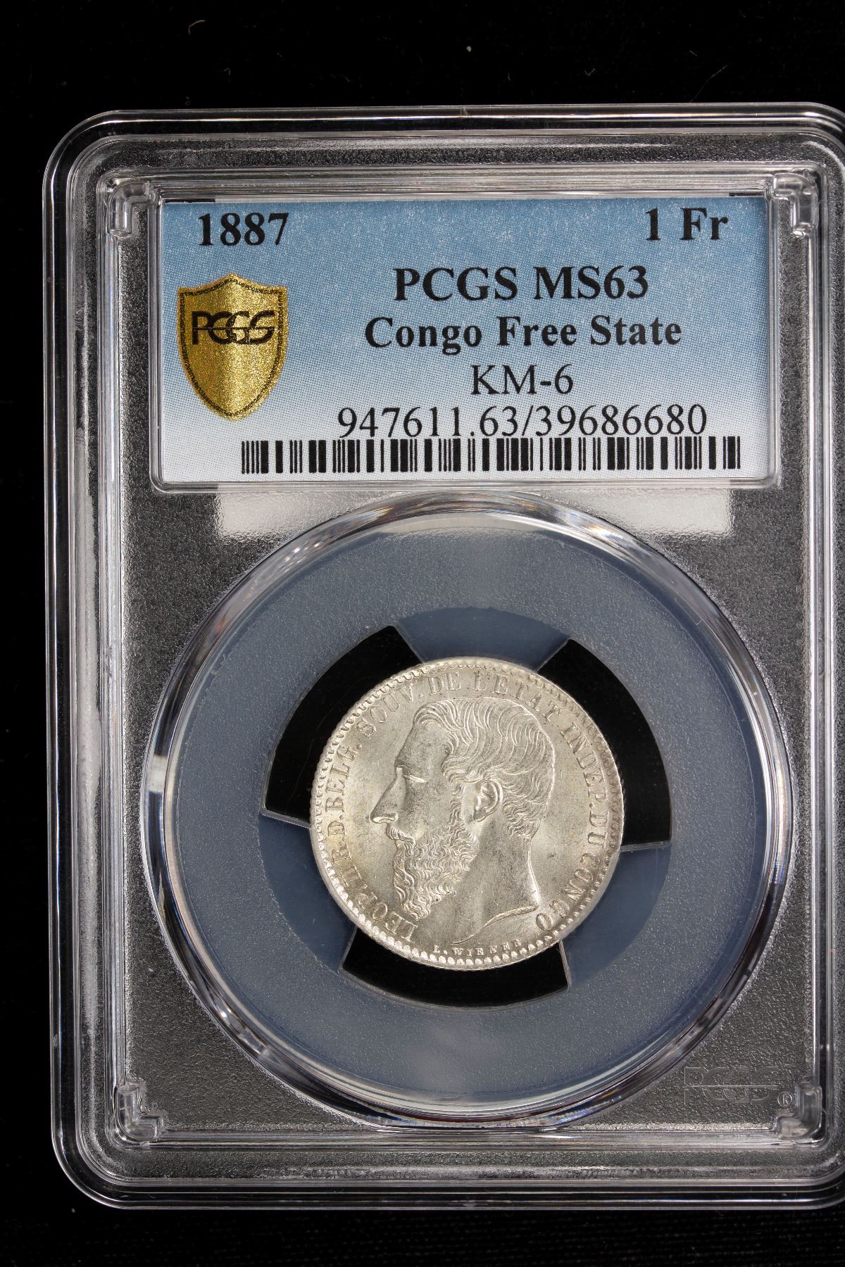 BELGIAN CONGO: Leopold II, 1885-1908, AR franc, 1887, KM-6, Congo Free State issue, cartwheel luster, PCGS graded MS63.
