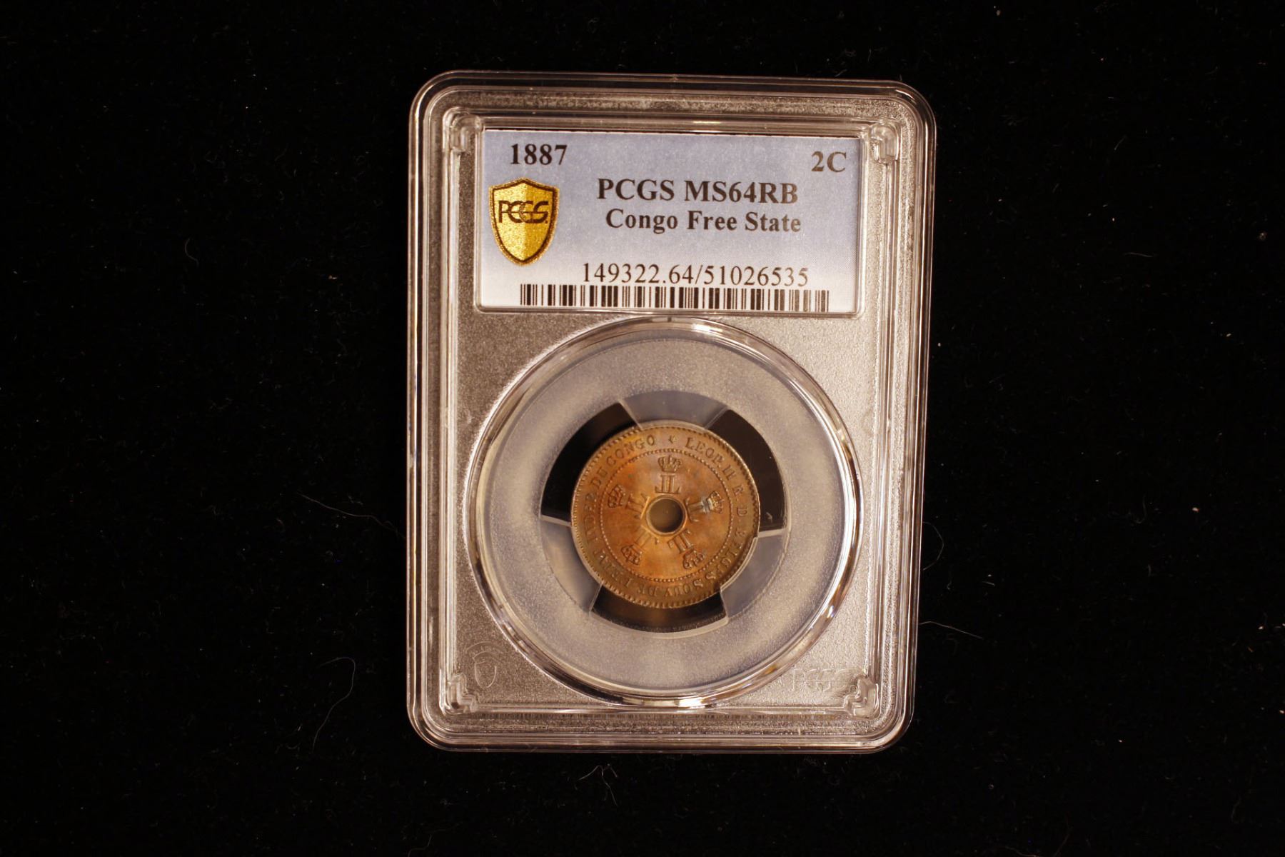 BELGIAN CONGO: Leopold II, 1885-1909, AE 2 centimes, 1887, KM-2, Congo Free State (État indépendant du Congo) issue,a wonderful mint state example! PCGS graded MS64 RB.