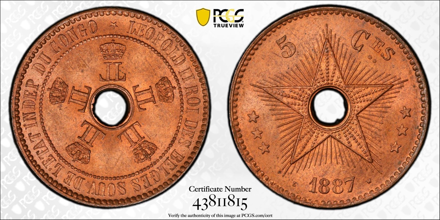 BELGIAN CONGO: Leopold II, 1885-1909, AE 5 centimes, 1887, PCGS graded MS64 RB
