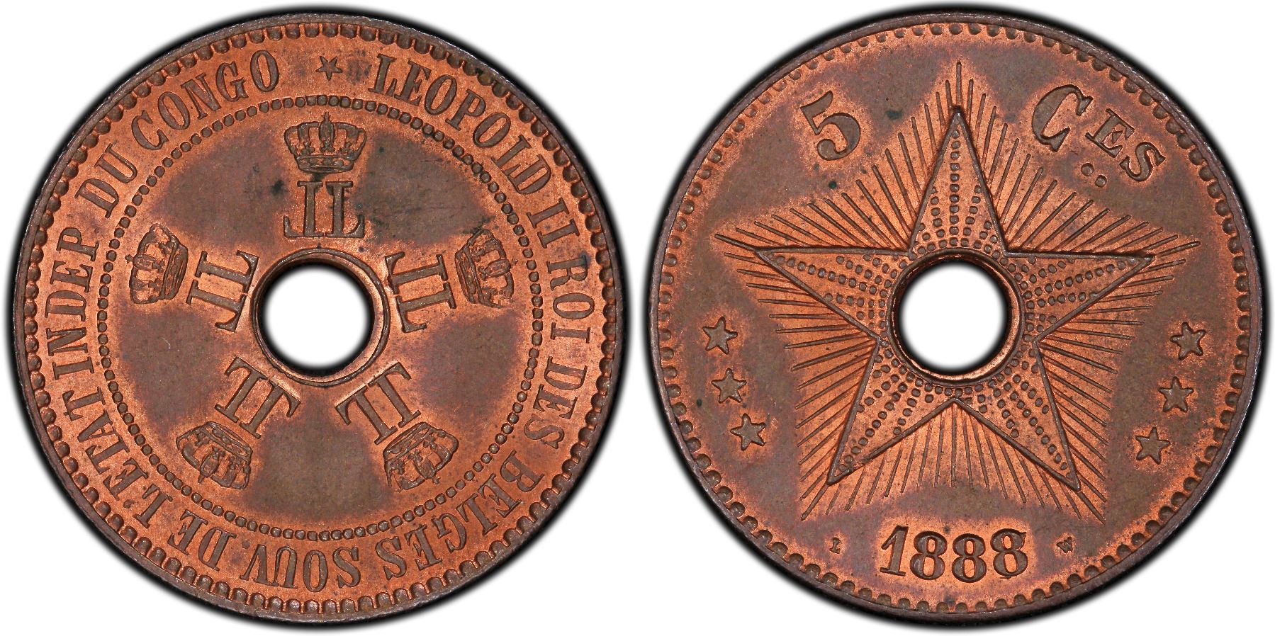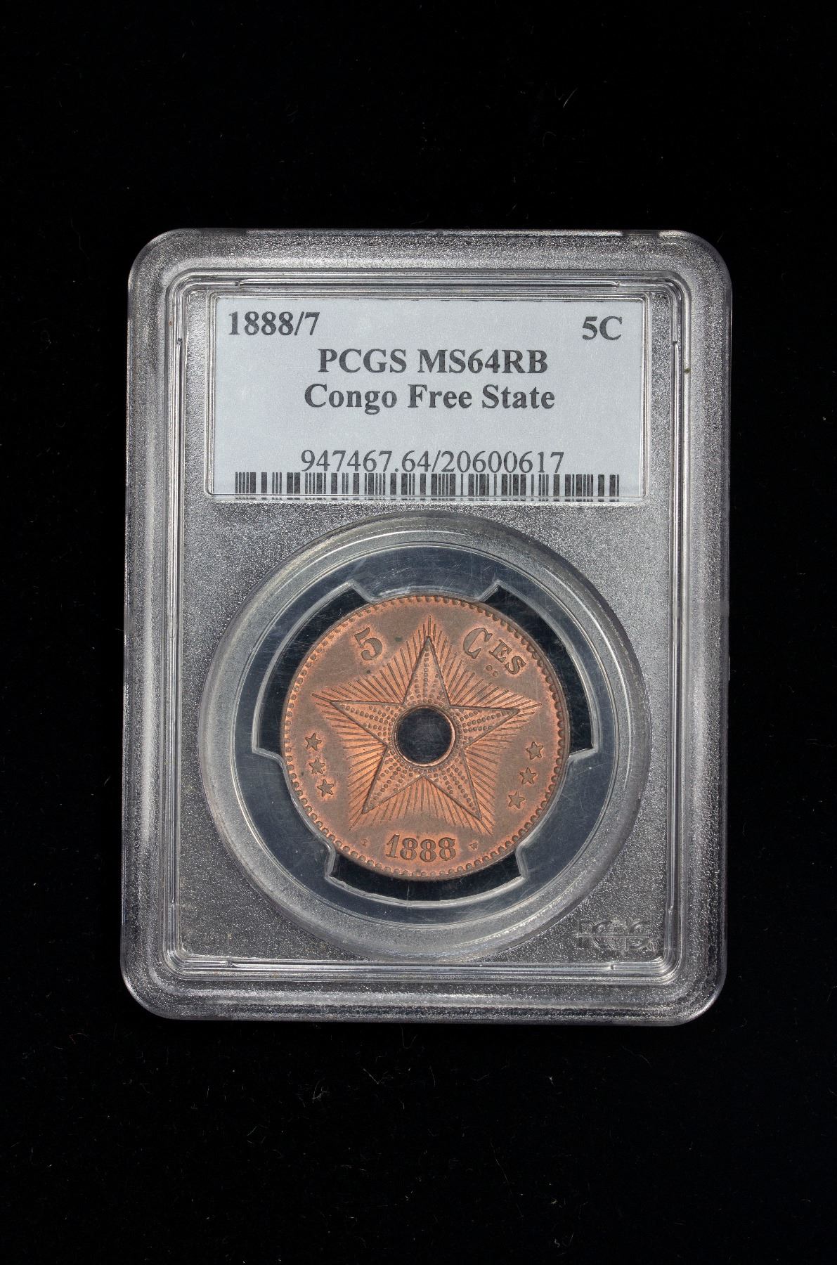BELGIAN CONGO: Leopold II, 1885-1909, AE 5 centimes, 1888/7, PCGS graded MS64 RB