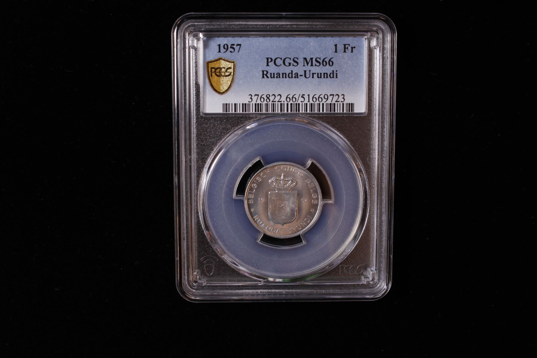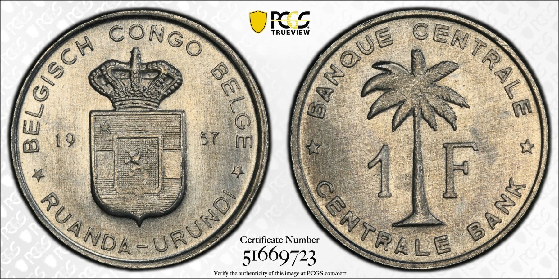 BELGIAN CONGO: Ruanda-Urundi, 1 franc, 1957, KM-4, a fantastic lustrous example! PCGS graded MS66. Ruanda-Urundi was governed as a United Nations trust territory from 1946 to 1962.