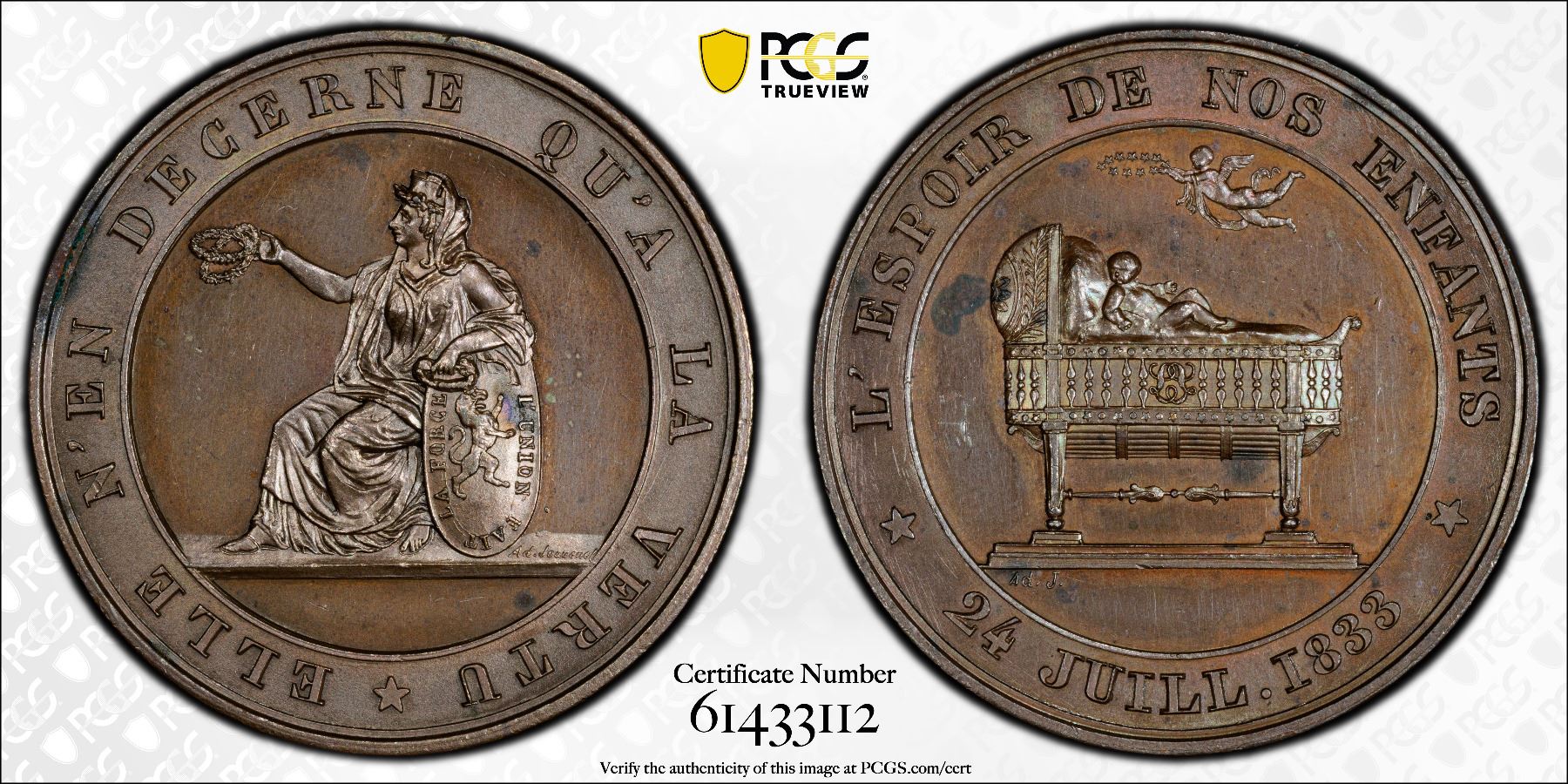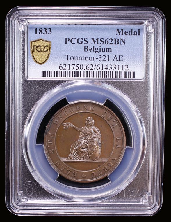 BELGIUM: AE medal, 1833, Tourneur-321, Guioth-193, 32mm silvered bronze medal on the Birth of Crown Prince Louis-Philippe, draped Belgium seated left with two victory wreaths in right hand and left arm resting on Belgian arms shield with ELLE N'EN DECERNE QU'A LA VERTU (The hope of our children) around // child in bassonet with cherub holding wreath above and "LE ESPOIR DE NOS ENFANTS - 24 JUILL. I833" around, plain edge, PCGS graded MS62 BN. Though lightly silvered, PCGS notes this as brown.