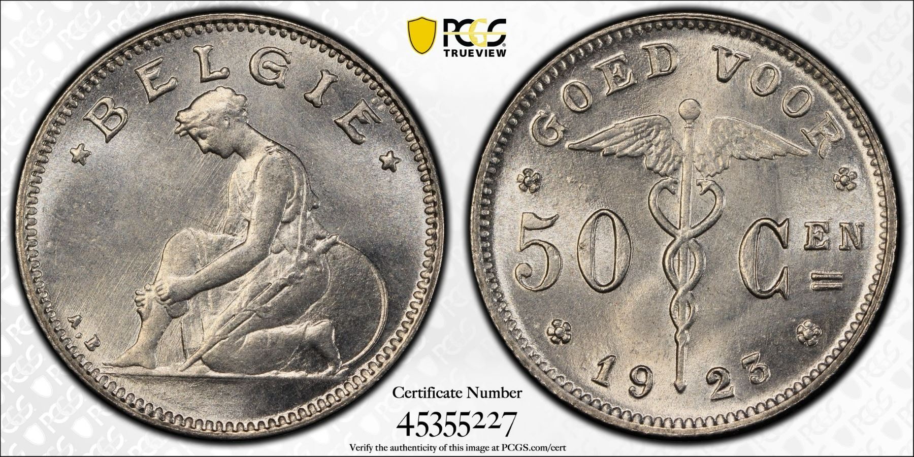 BELGIUM: Albert I, 1909-1934, 50 centimes, 1923, PCGS MS65