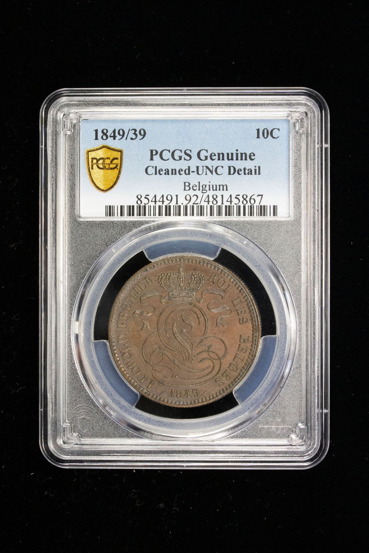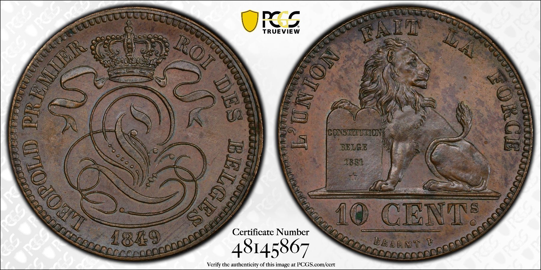BELGIUM: Leopold I, 1831-1865, AE 10 centimes, 1849/39, KM-2.1, Morin-65a, signature without point, rare overdate, lovely brown patina, very faint traces of old cleaning, PCGS graded UNC details.