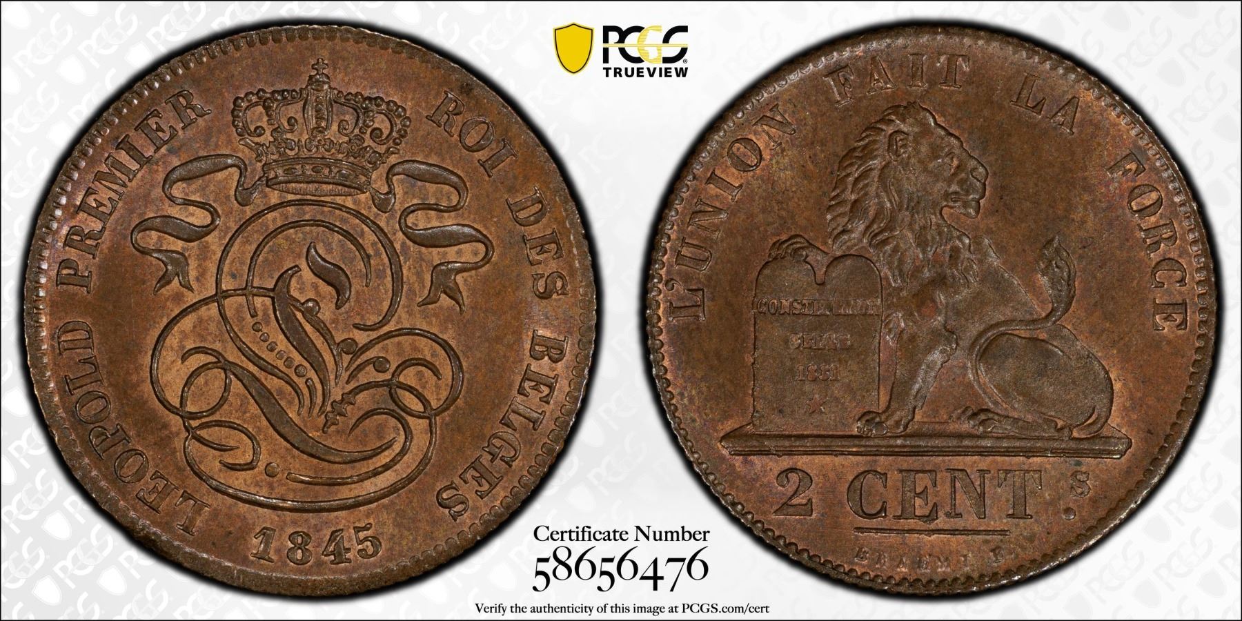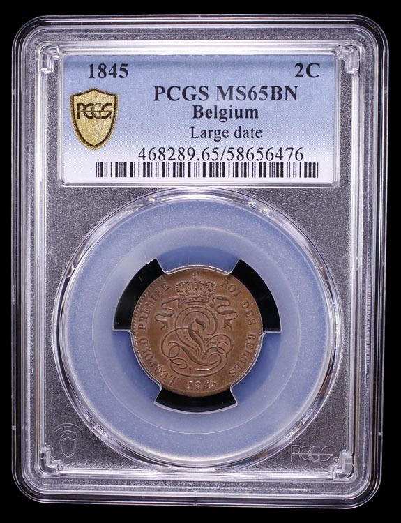 BELGIUM: Leopold I, 1831-1865, AE 2 centimes, 1845, PCGS MS65 BN