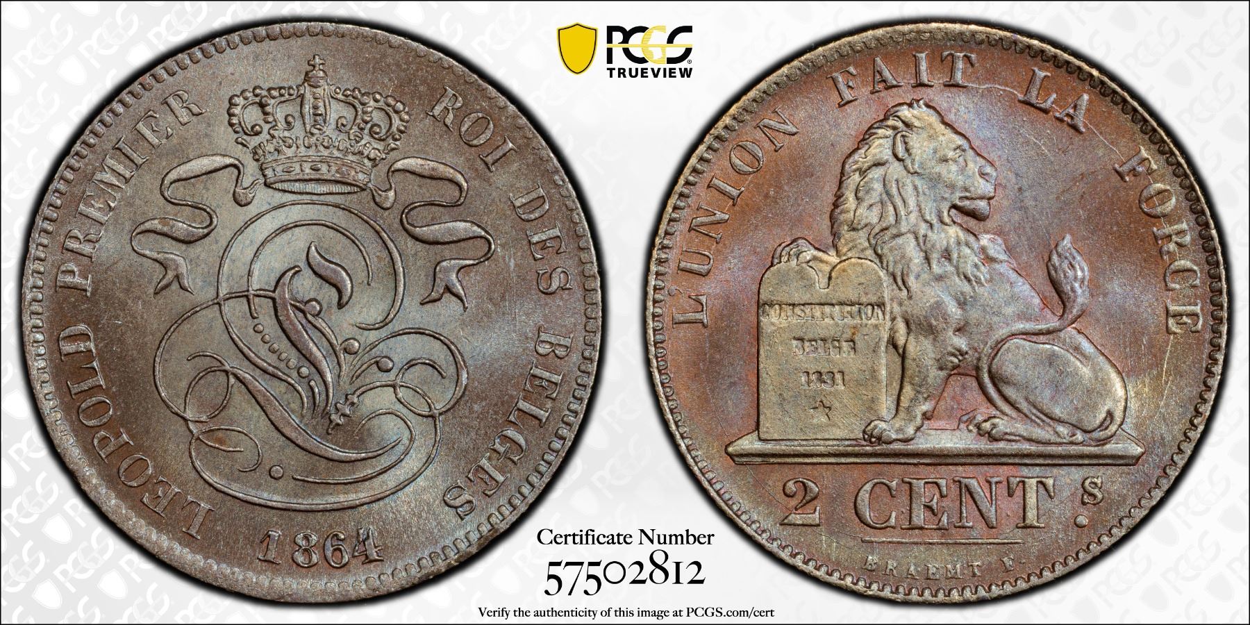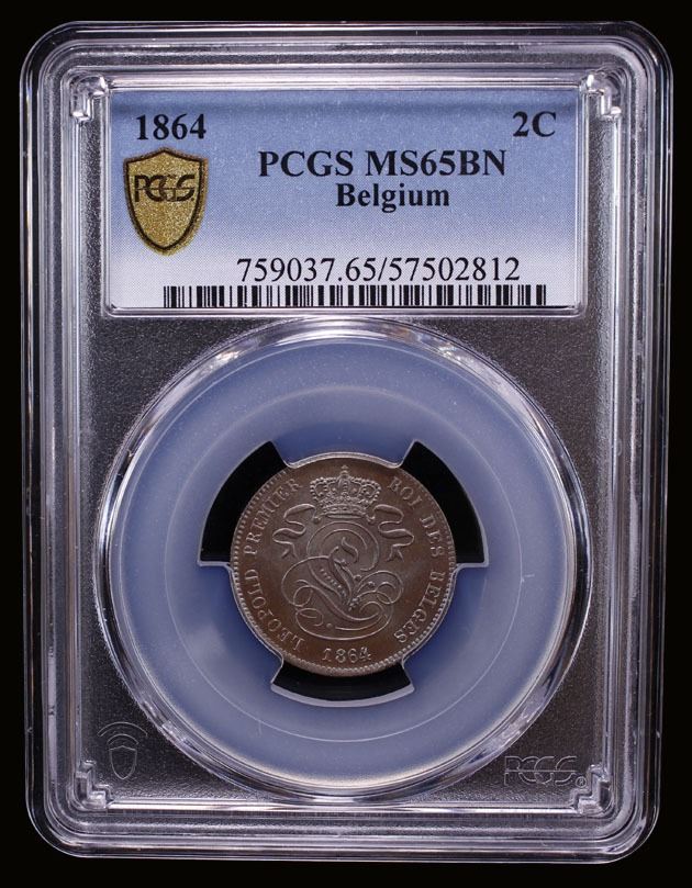 BELGIUM: Leopold I, 1831-1865, AE 2 centimes, 1864, KM-4.2, crowned monogram // lion with tablet, lovely and lustrous, PCGS graded MS65 BN. Tied with only one other example for finest graded (Top Pop) at PCGS.
