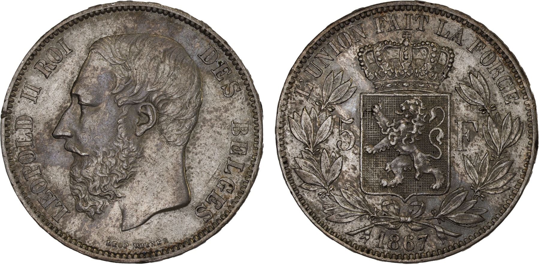 BELGIUM: Leopold II, 1865-1909, AR 5 francs, 1867, XF