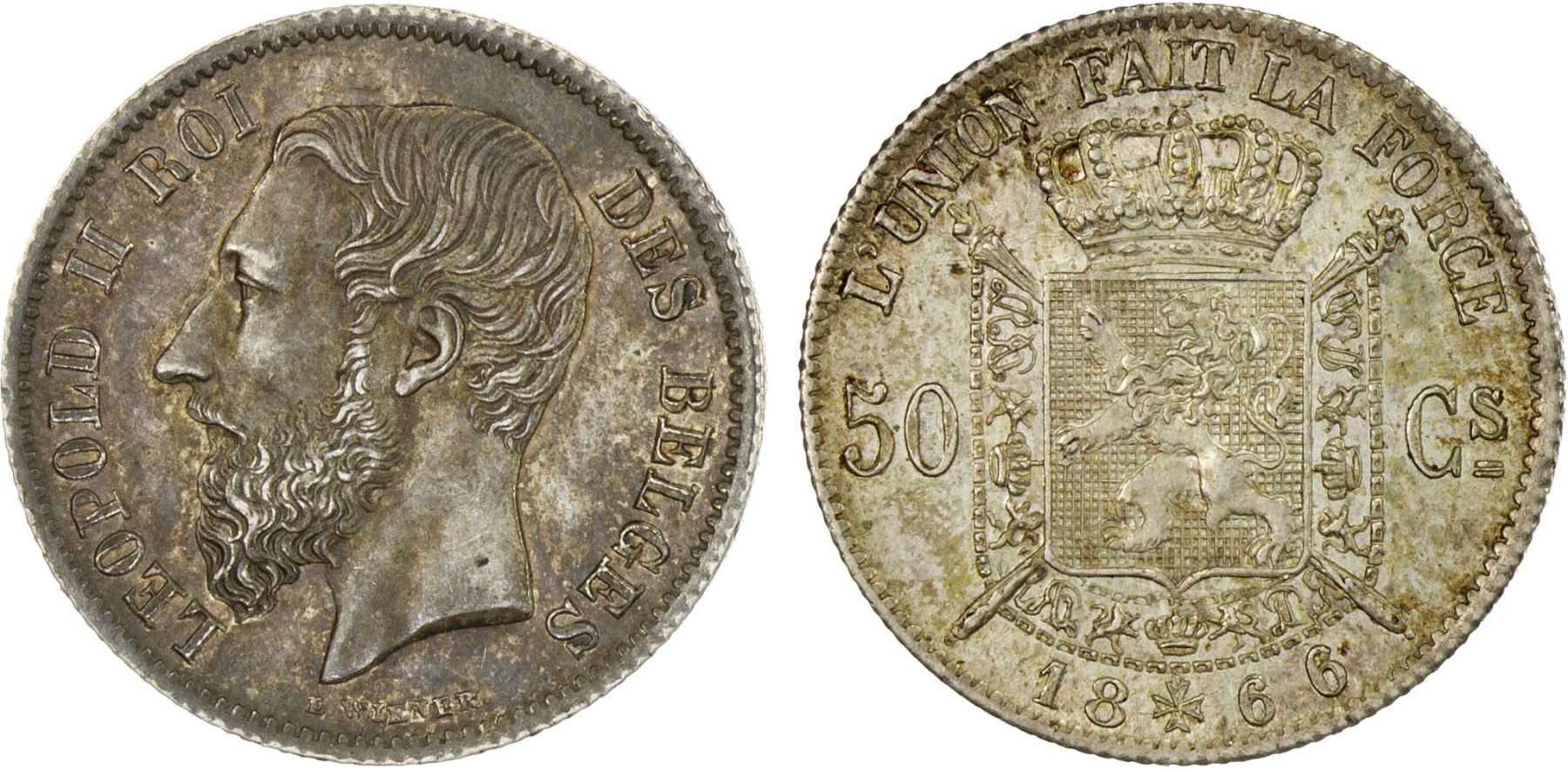 BELGIUM: Leopold II, 1865-1909, AR 50 centimes, 1866, AU