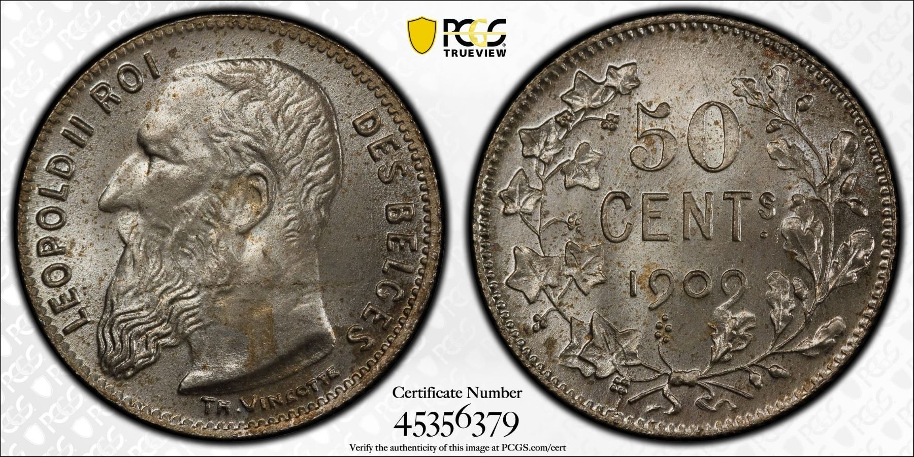BELGIUM: Leopold II, 1865-1909, AR 50 centimes, 1909, PCGS MS66