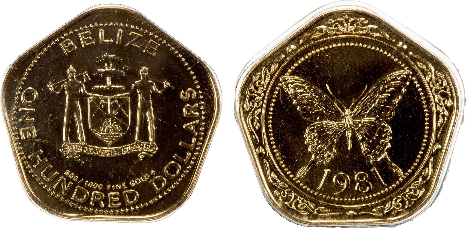 BELIZE: AV 100 dollars, 1981-FM (U), KM-67, yellow swallowtail (Papilio machaon) butterfly on pentagonal planchet, sealed in original Franklin Mint packaging, mintage of only 200 pieces, Brilliant Unc, R.