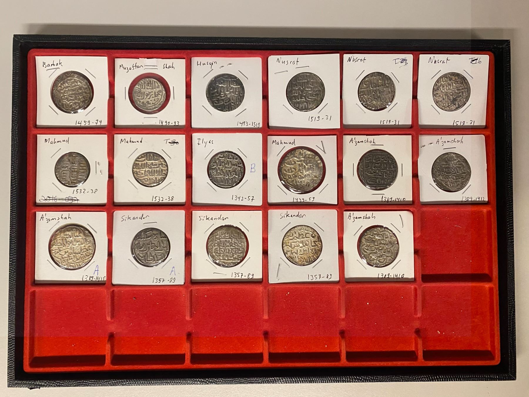 BENGAL: LOT of 17 silver tankas, including Ilyas, 1342-1357 (1 pcs, Sikandar, 1357-1389 (3), A'zamshah, 1389-1410 (4), Mahmud, 1433-1459 (1), Barbak, 1459-1474 (1), Muzaffar Shah, 1490-1493 (1), Husain, 1493-1519 (1), Nusrat, 1519-1531 (3), and Mahmud, 1532-1538 (2); nearly all are VF, with many better, most struck before 1493 with the usual banker's marks; nearly all without mint name and only a few with legible date; retail value $700, lot of 17 pieces.