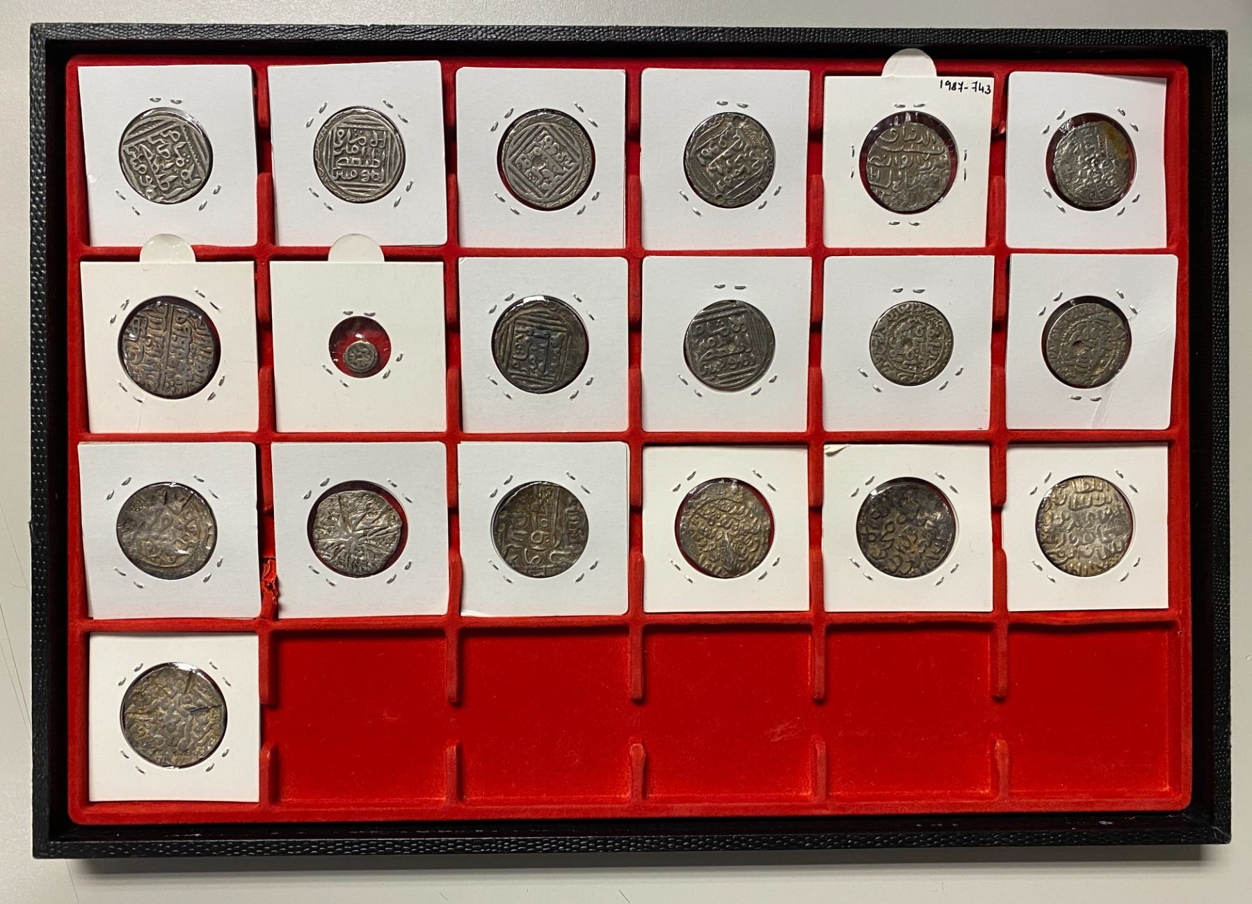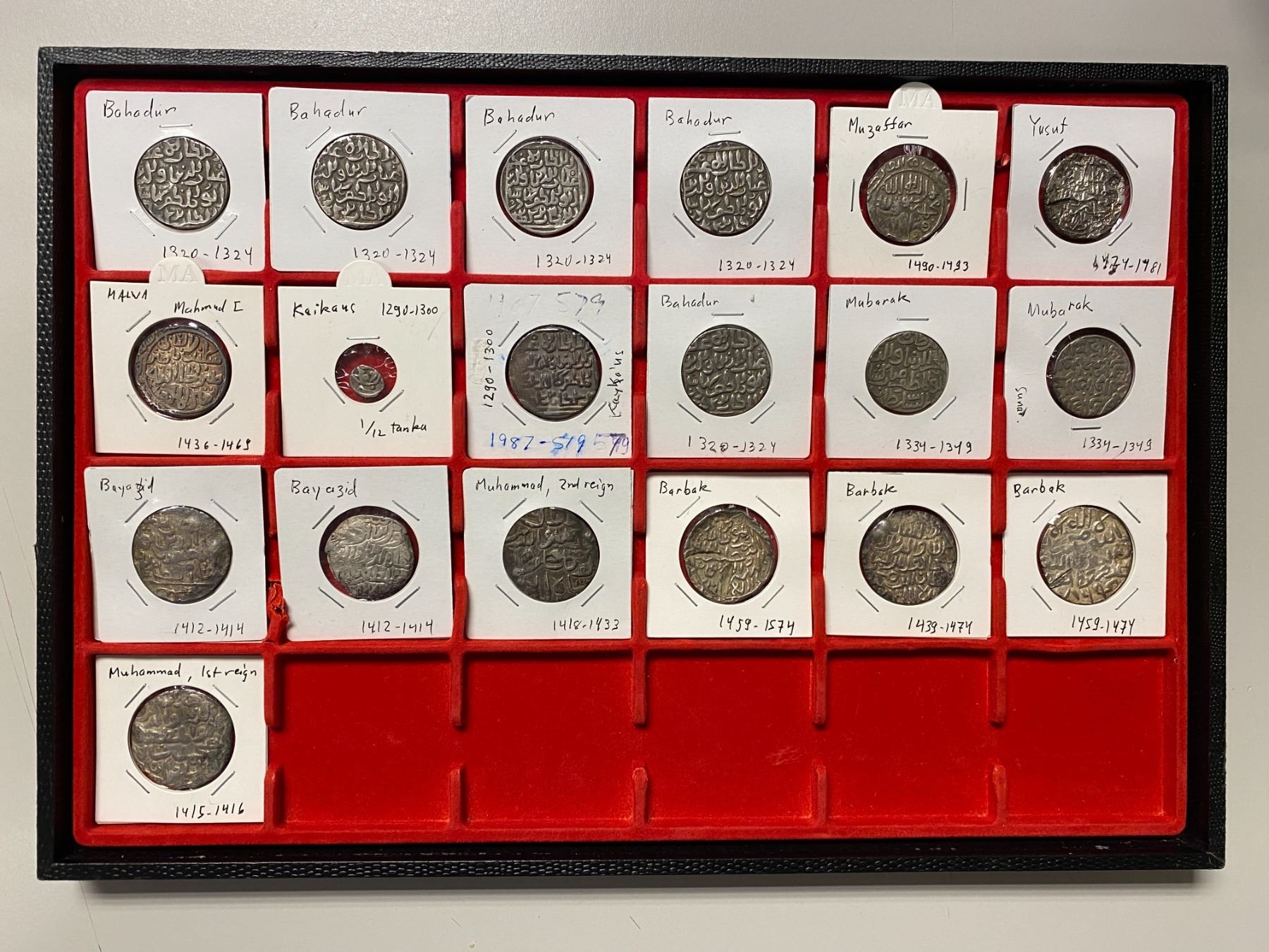 BENGAL: LOT of 19 silver coins, various rulers, some scarce, all tankas except 1 of Kaykaus: Kaikaus, 1290-1300 (2 pcs, one tanka, one 1/12 tanka); Bahadur, 1320-1324 (5); Mubarak, 1334-1349 (2); Bayezid, 1412-1414 (2); Muhammad, 1st reign, 1415-1416 (1); Muhammad, 2nd reign, 1418-1433 (1); Barbak, 1459-1474 (3); Yusuf, 1474-1481 (1); Muzaffar, 1490-1493 (1); and Mahmud I of Malwa, 1436-1469 (1); the earliear rulers mostly with 1 to 3 testmarks, rulers from 1412 onwards nearly all with many testmarks and gouges; retail value $900, lot of 19 pieces.