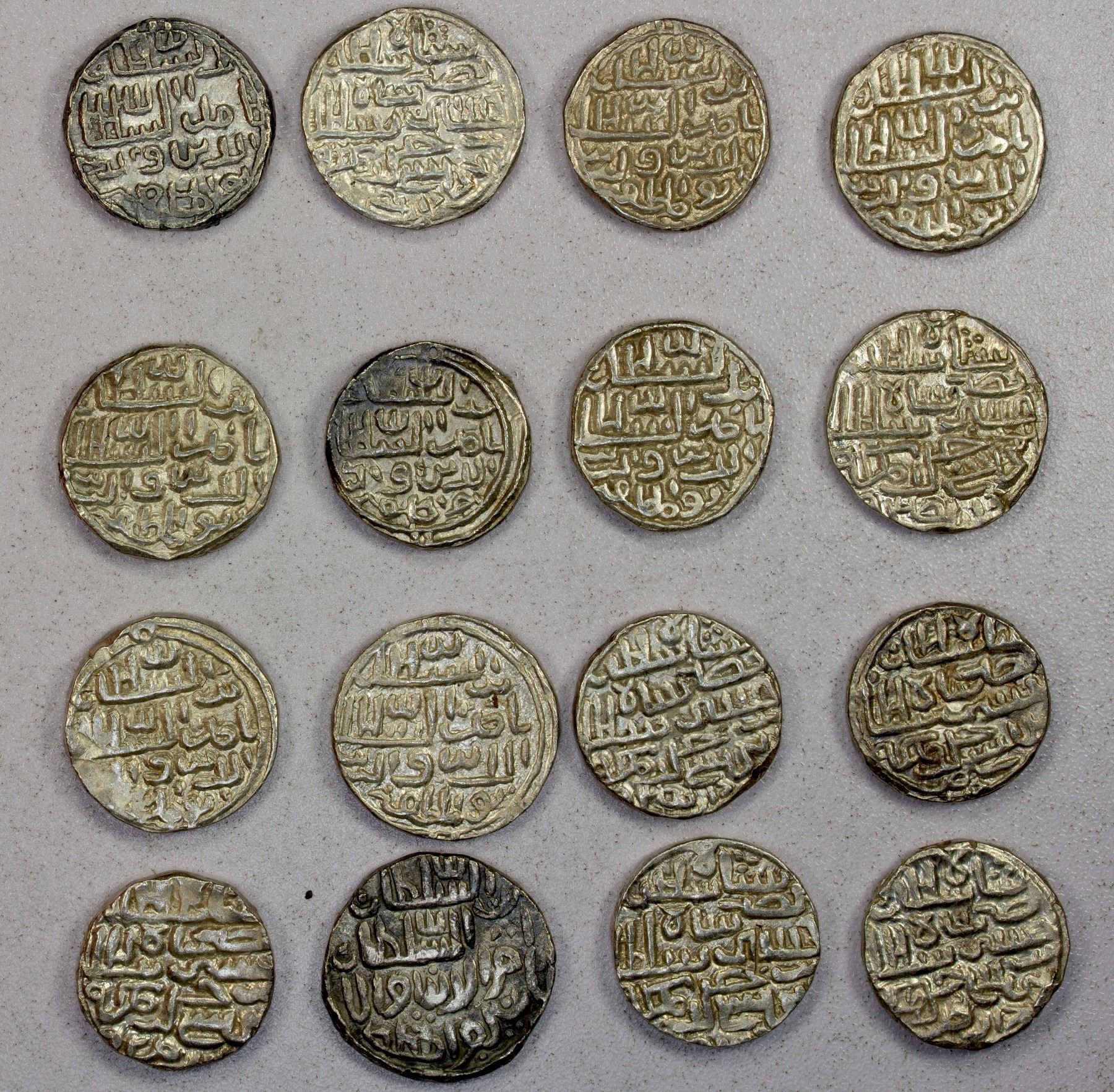 BENGAL: Nusrat Shah, 1519-1531, LOT of 16 silver tankas, type Goron-B824, mint of Dar al-Darb ("place of striking coins"), EF condition, just a few with minor weakness or edge banker's marks; retail value $640, lot of 16 pieces.
