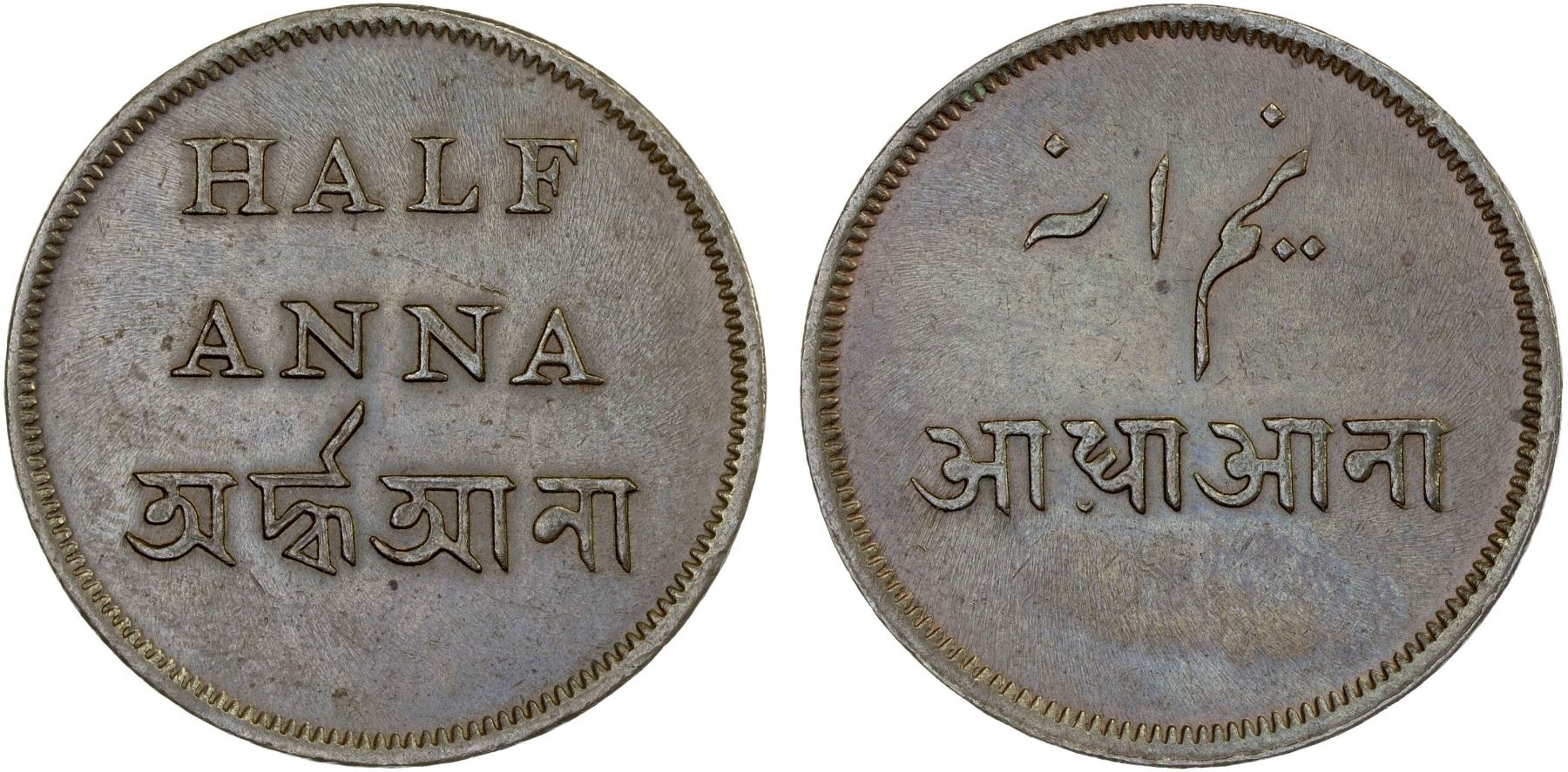 BENGAL PRESIDENCY: AE 1/2 anna, Calcutta, ND (1831-1835), Stv-9.29, Prid-213, denomination in 4 languages, no other text, lovely AU.