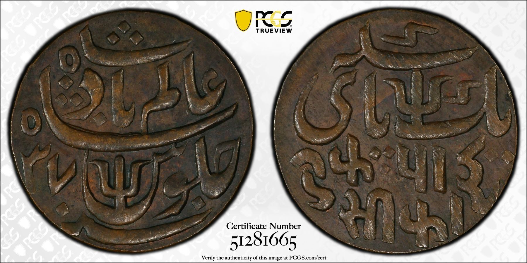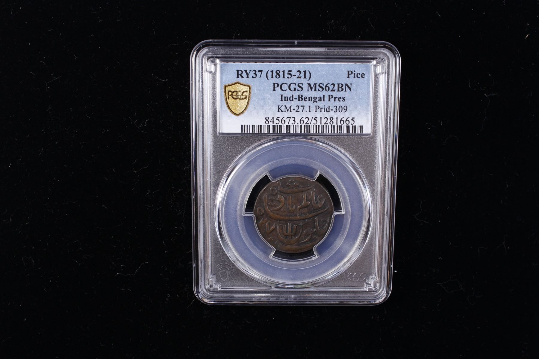 BENGAL PRESIDENCY: AE pice (6.48g), year 37, KM-27.1, Stv-7.186. Prid-309, East India Company issue in the name of the Mughal Emperor Shah Alam II, struck 1815-29, a pleasing mint state example, PCGS graded MS62 BN