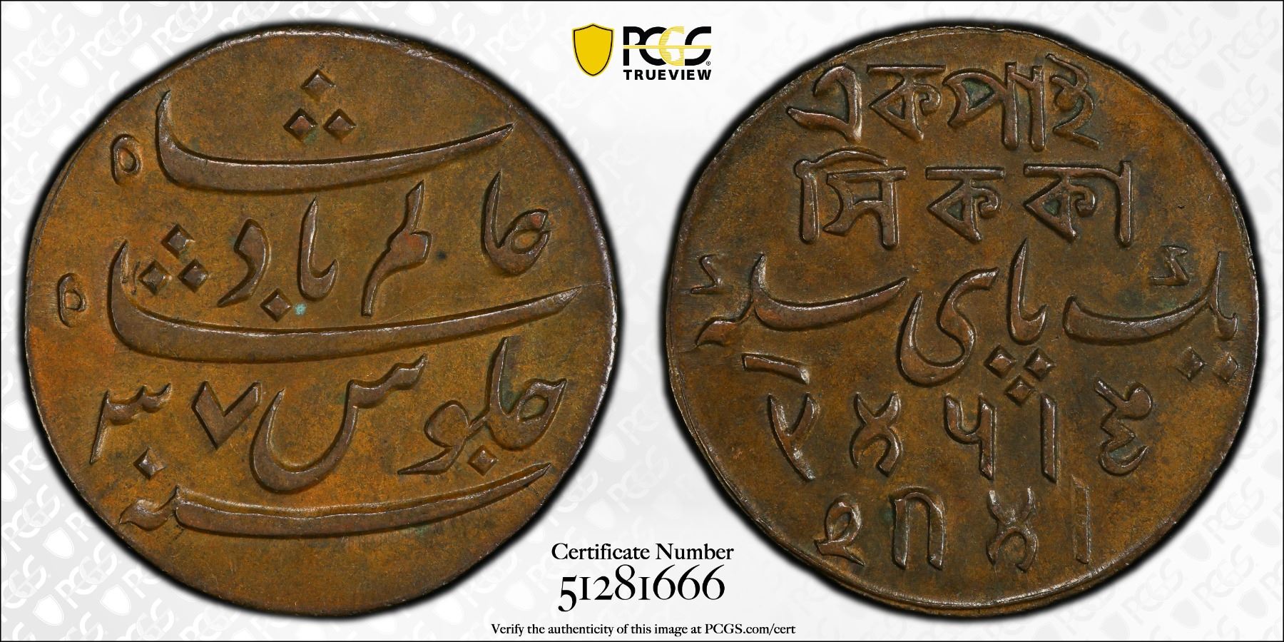 BENGAL PRESIDENCY: AE pice (8.73g), year 37, KM-53, Prid-204, East India Company issue in the name of the Mughal Emperor Shah Alam II, struck at the Calcutta mint 1796-1809, an attractive nearly mint state example, PCGS graded AU58.