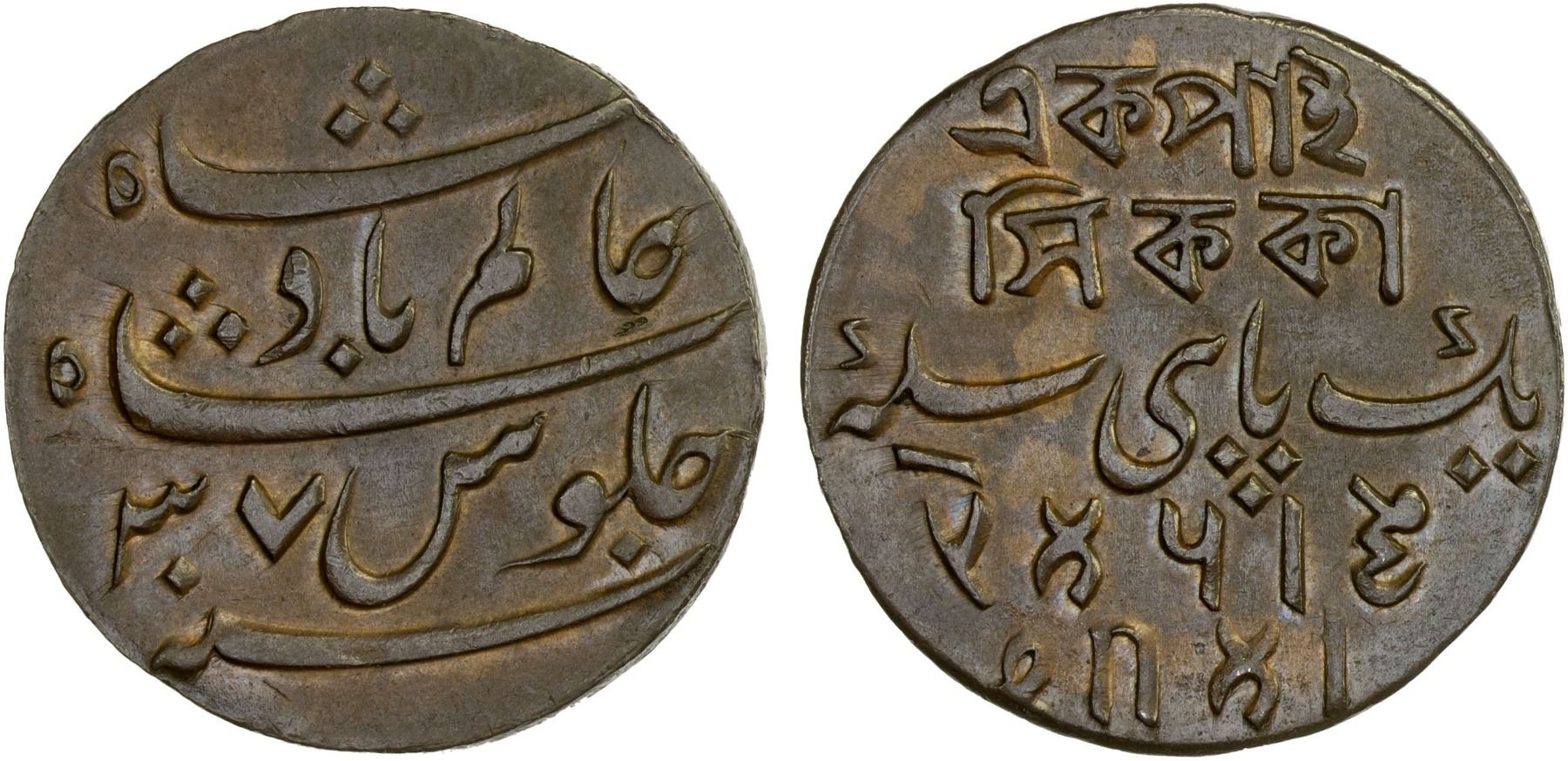 BENGAL PRESIDENCY: AE pice, year 37, KM-52, struck in 1795, red & brown lustrous, AU.