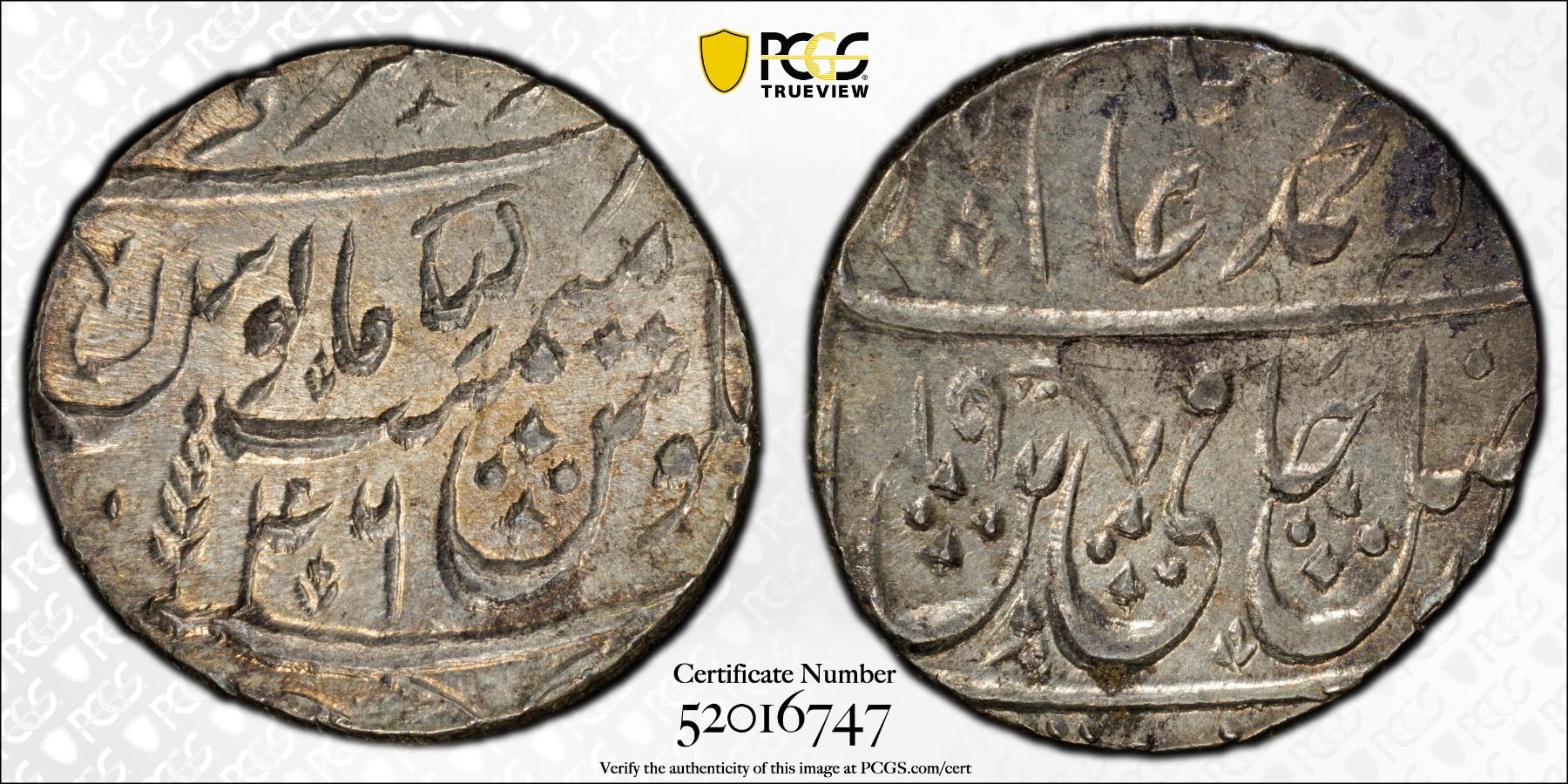 BENGAL PRESIDENCY: AR rupee (11.09g), Saharanpur, AH1219 year 46, KM-693, Stv-8.128., East India Company issue, in the name of Shah Alam II, vertical sprig left of regnal year, a pleasing lustrous mint state example! PCGS graded MS62. Saharanpur was ceded to the East India Company in 1803 from the Sindhia Marathas, and the mint was permanently closed in or shortly before September 1805. This type is listed under the Mughal Empire in the Standard Catalog of World Coins.