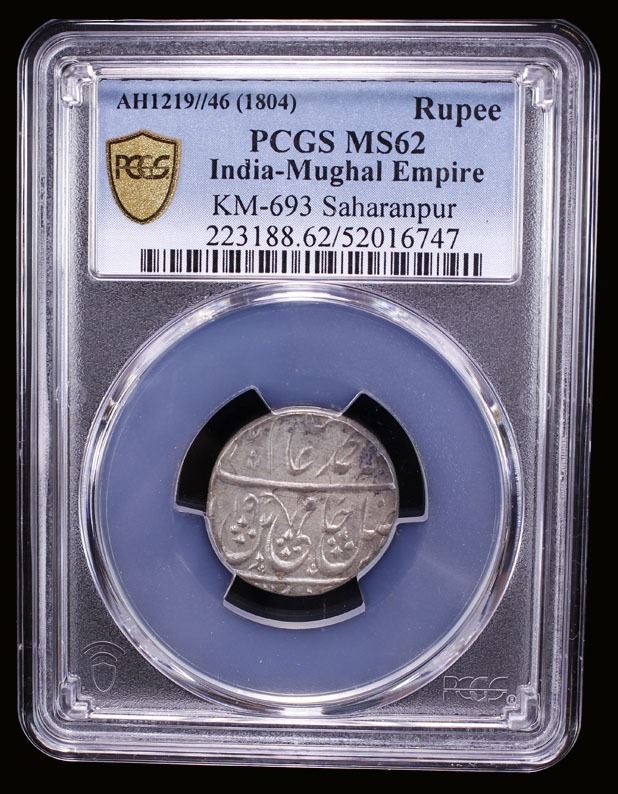 BENGAL PRESIDENCY: AR rupee (11.09g), Saharanpur, AH1219 year 46, KM-693, Stv-8.128., East India Company issue, in the name of Shah Alam II, vertical sprig left of regnal year, a pleasing lustrous mint state example! PCGS graded MS62. Saharanpur was ceded to the East India Company in 1803 from the Sindhia Marathas, and the mint was permanently closed in or shortly before September 1805. This type is listed under the Mughal Empire in the Standard Catalog of World Coins.