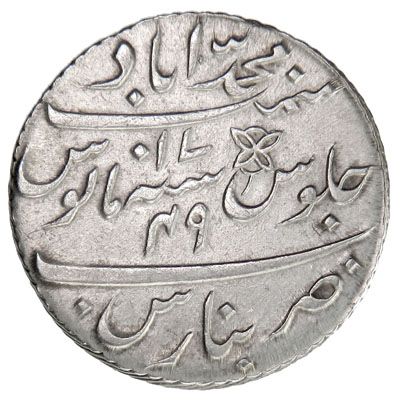 BENGAL PRESIDENCY: AR rupee (11.33g), Muhammadabad Banaras, AH1229 years 17 & 49, KM-42, machine struck, oblique reeding, EF to About Unc.