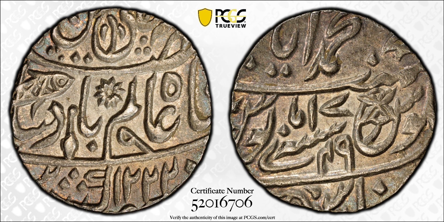 BENGAL PRESIDENCY: AR rupee (11.33g), Muhammadabad Benares, AH1222 year 17/49, KM-40.1, East India Company issue, with fish, star, and flower privy (darogah) marks, a pleasing mint state example, PCGS graded MS62.