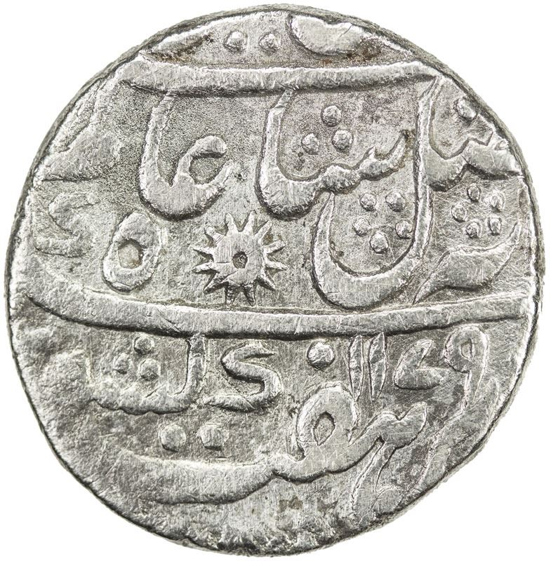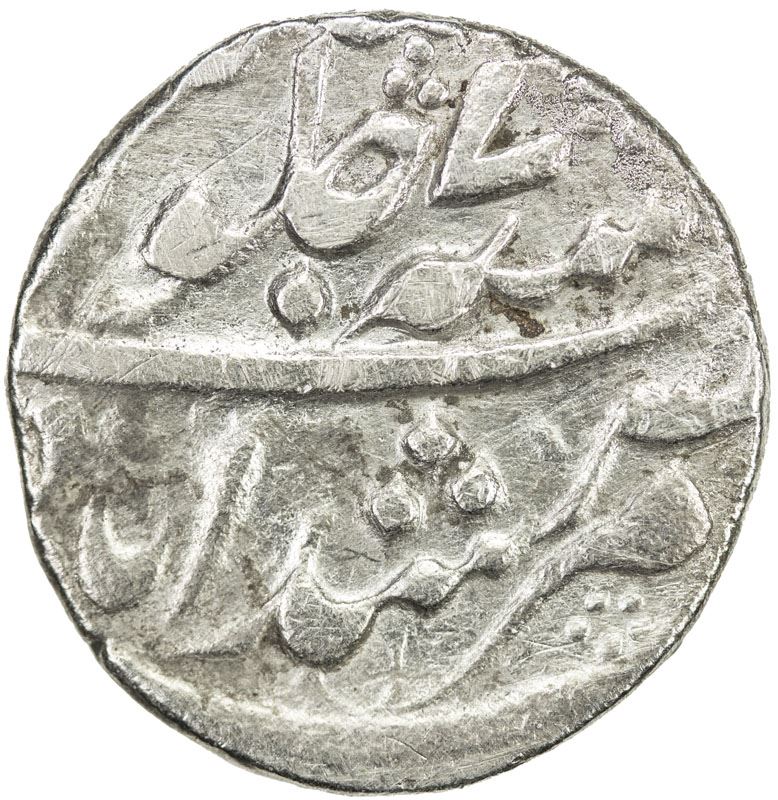 BENGAL PRESIDENCY: AR rupee (11.41g), "Murshidabad", AH1179 year 7, Stv-2.71. KM-84.1. Prid-87, Calcutta mint, 1 banker's mark on edge, harshly cleaned, VF, ex Paul Stevens Collection.    This is the earliest issue of this type known to Pridmore.