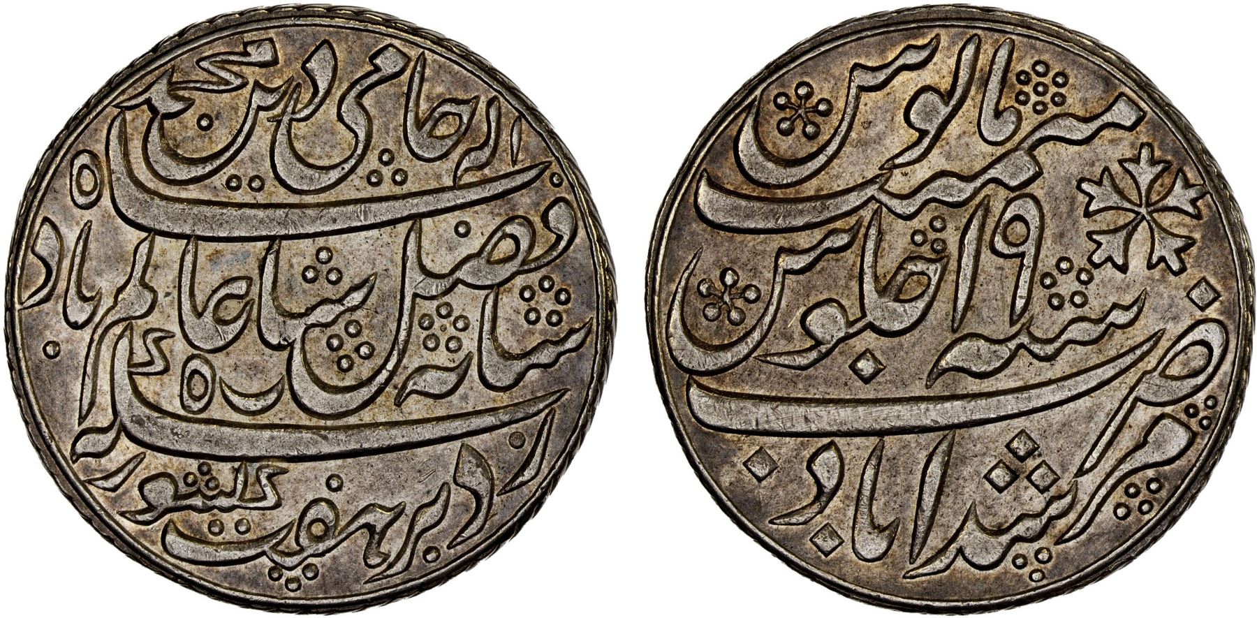BENGAL PRESIDENCY: AR rupee (11.62g), Murshidabad, year "19", Stv-5.6, Prid-166, struck at the Murshidabad mint (1794-1795), identified by the dot in the middle circle on the obverse, XF, R.