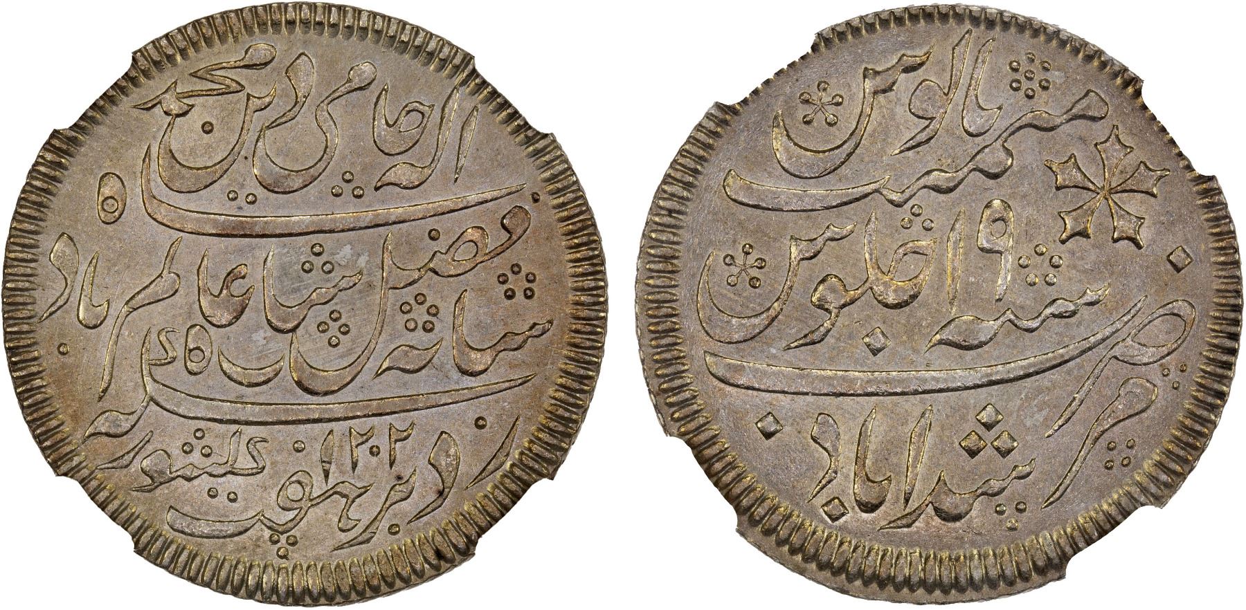 BENGAL PRESIDENCY: AR rupee, "Murshidabad", AH1202 year 19 (frozen), Stv-4.9, Prid-153. KM-106, struck at Calcutta, oblique milling right, no dots within the obverse rosettes, wide borders, struck only in 1792, one of the world's earliest machine-struck coins, NGC graded MS62, RRR. Pridmore attributed this type with its wide rims to trials that took place in 1790. Stevens, however, favors the year 1792 when a trial of the new laminating and cutting machinery took place at the Calcutta mint. It is reported that only 1000 pieces were struck (not necessarily correct amount), then replaced by the narrow border type.