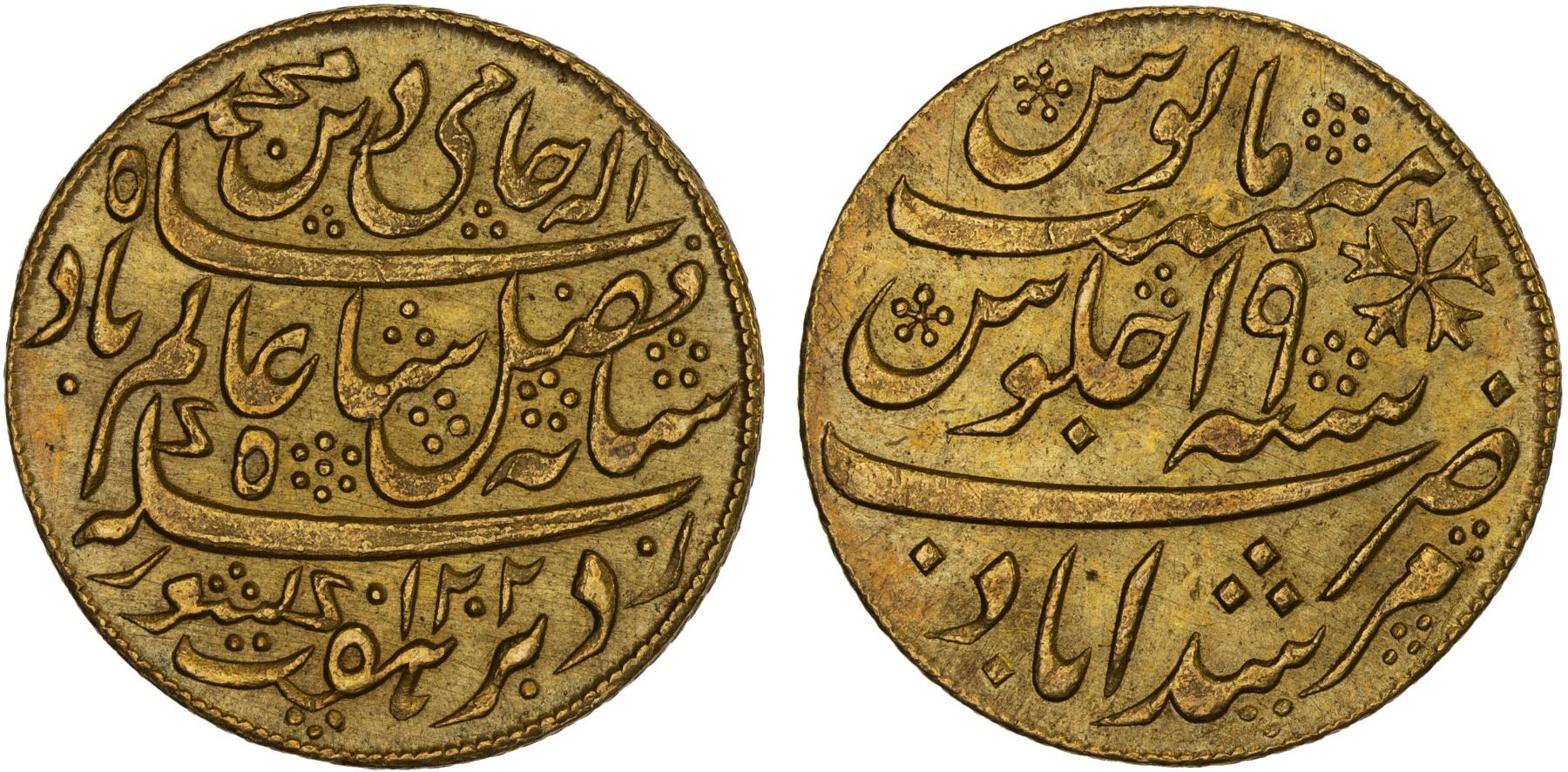 BENGAL PRESIDENCY: AV 1/2 mohur (6.15g), "Murshidabad", AH1202 year 19, Stv-4.5. Prid-63. KM-101, struck at Calcutta 1793-1818, oblique milling right, bold XF, Scarce, ex Paul Stevens Collection, ex. F. Pridmore Collection.