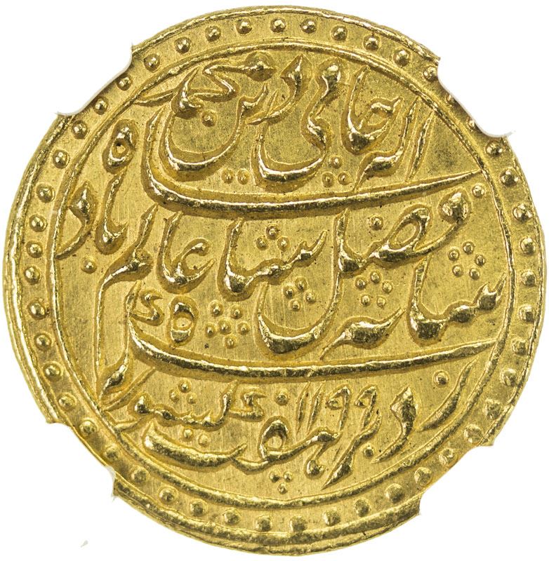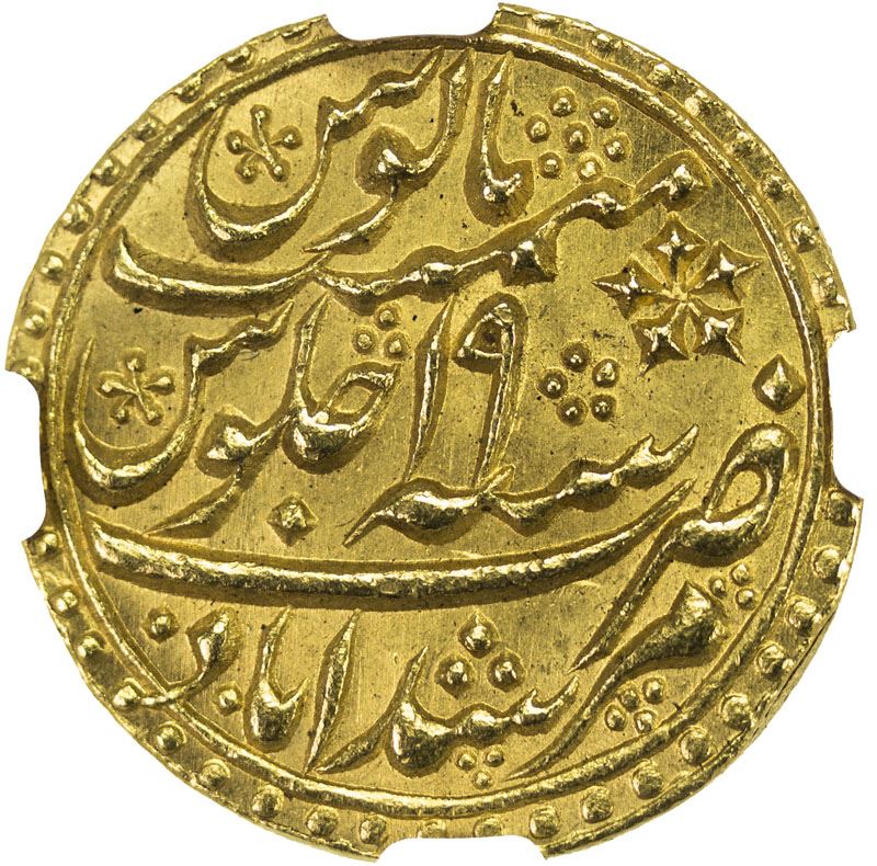 BENGAL PRESIDENCY: AV mohur (12.37g), "Murshidabad", AH1199 year 19, KM-94, Stv-2.29. Prid-34, struck at Calcutta, magnificent strike, NGC graded MS64, RR, ex Paul Stevens Collection.
