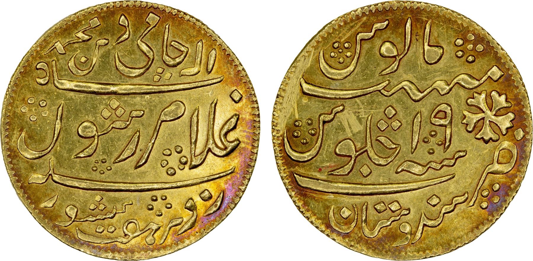 BENGAL PRESIDENCY: Jeweler's Imitations, AV mohur (8.81g), "Hindustan", year "19", KM-103, light-weight jeweler's imitation of type KM-103.2, undated and with clear mint name Hindustan, probably 19th century; several scratches on the reverse; actual fineness unknown, AU. The middle panel of the obverse legend is replaced by "ghulâm rasûl", possibly someone's name.
