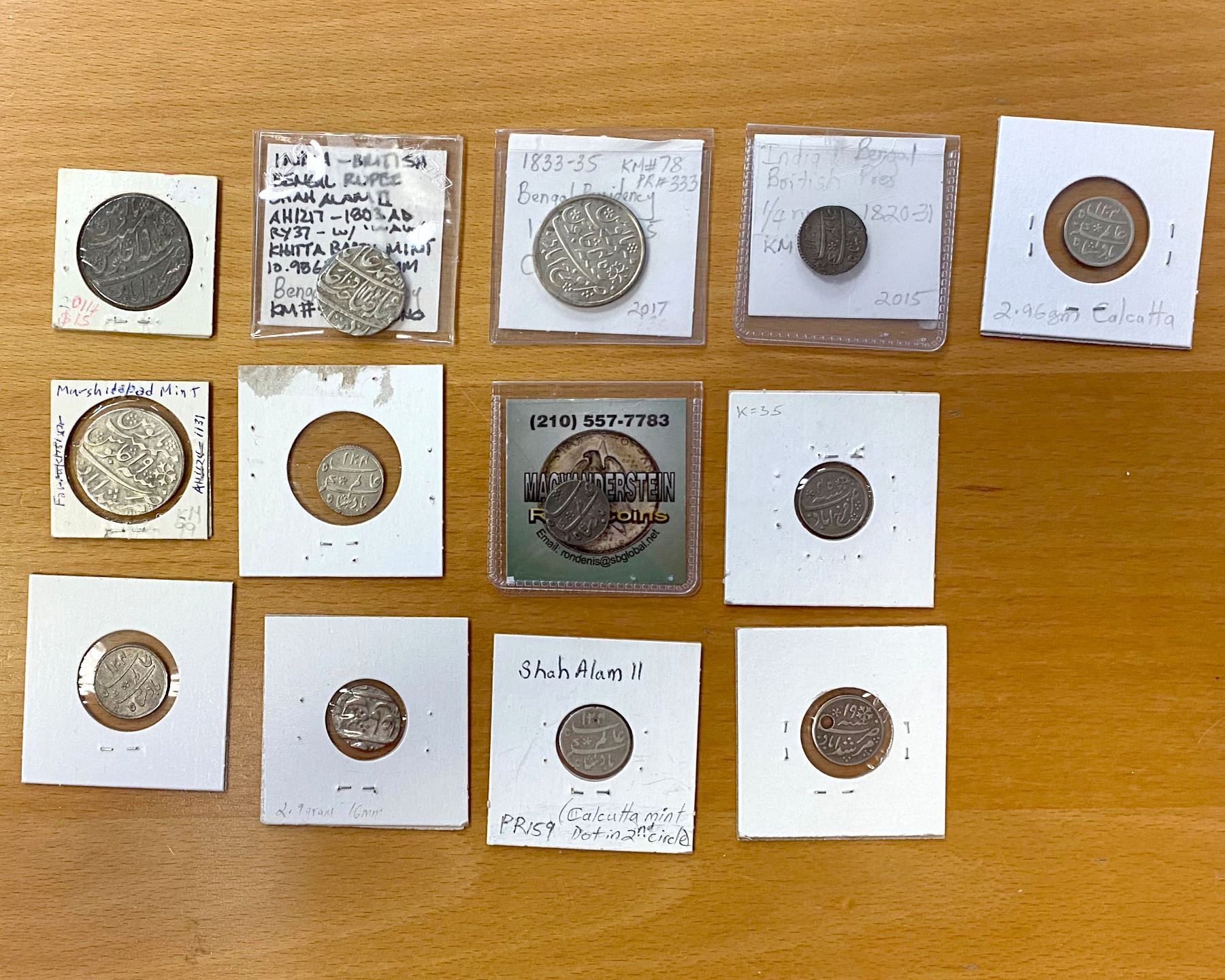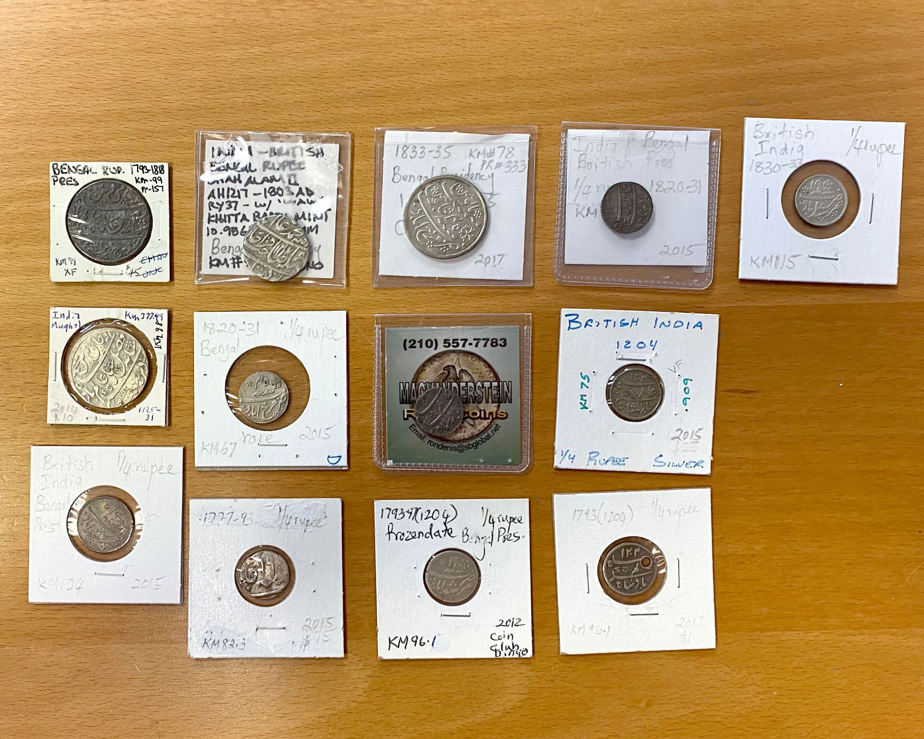 BENGAL PRESIDENCY: LOT of 13 silver coins, 1/4 rupee: KM-67 (2 pcs, both VF), KM-73 (EF), KM-75 (VF), KM-82.3 (VF), KM-96.1 (2 pcs, both Fine, one holed), KM-104 (EF-AU), and KM-115 (VF); and rupee: KM-52.3 (VF), KM-78 (VF-EF), KM-98 (VF), and KM-99 (VF); all in holders, cataloged by the consignor; retail value $375, lot of 13 pieces.
